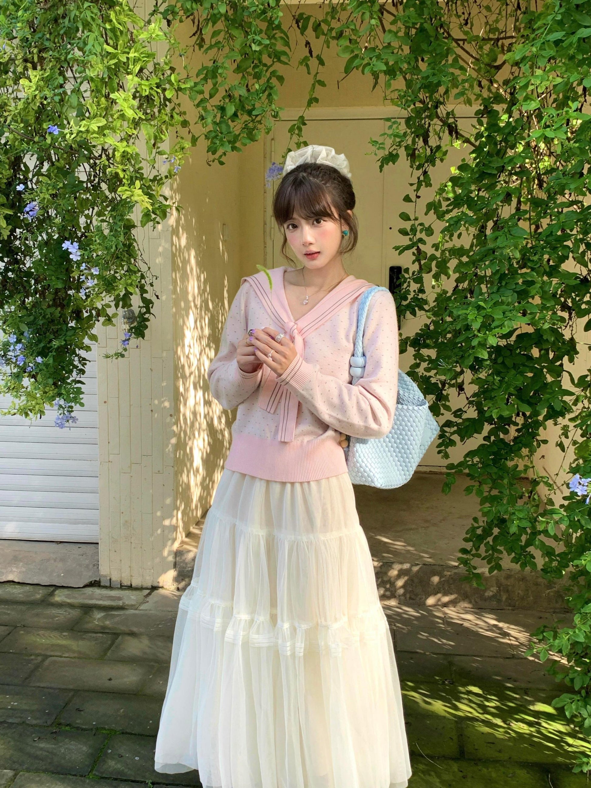 - Top: Polka dot knit top with navy sailor collar, slim waist design.