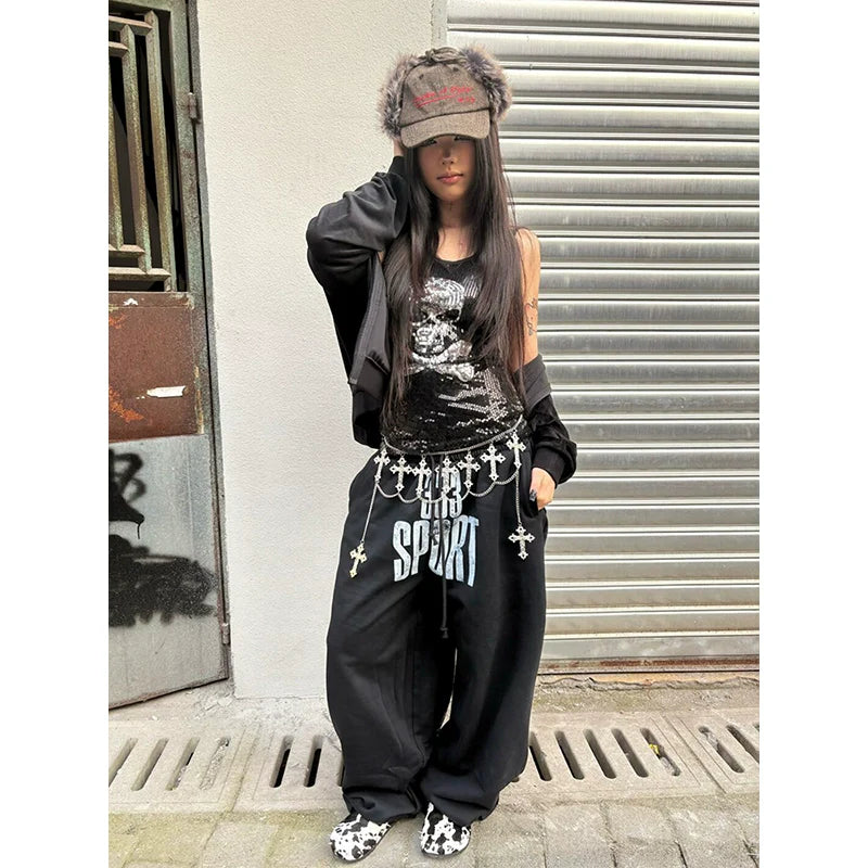- Bottom: Heavyweight black baggy sweatpants with wide leg fit, Y2K subculture casual style.