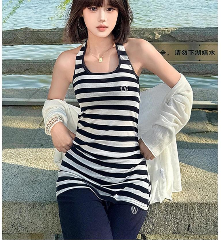 - Top: Sleeveless halter tank top with black and white stripes, slim-fit and lightweight for summer.