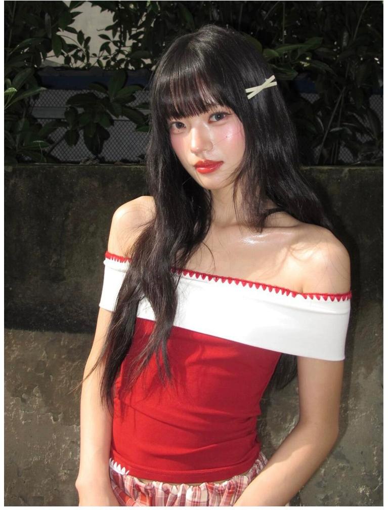 - Top: Slim-fit short-sleeve tee with colorblock and off-shoulder design, soft summer fabric.