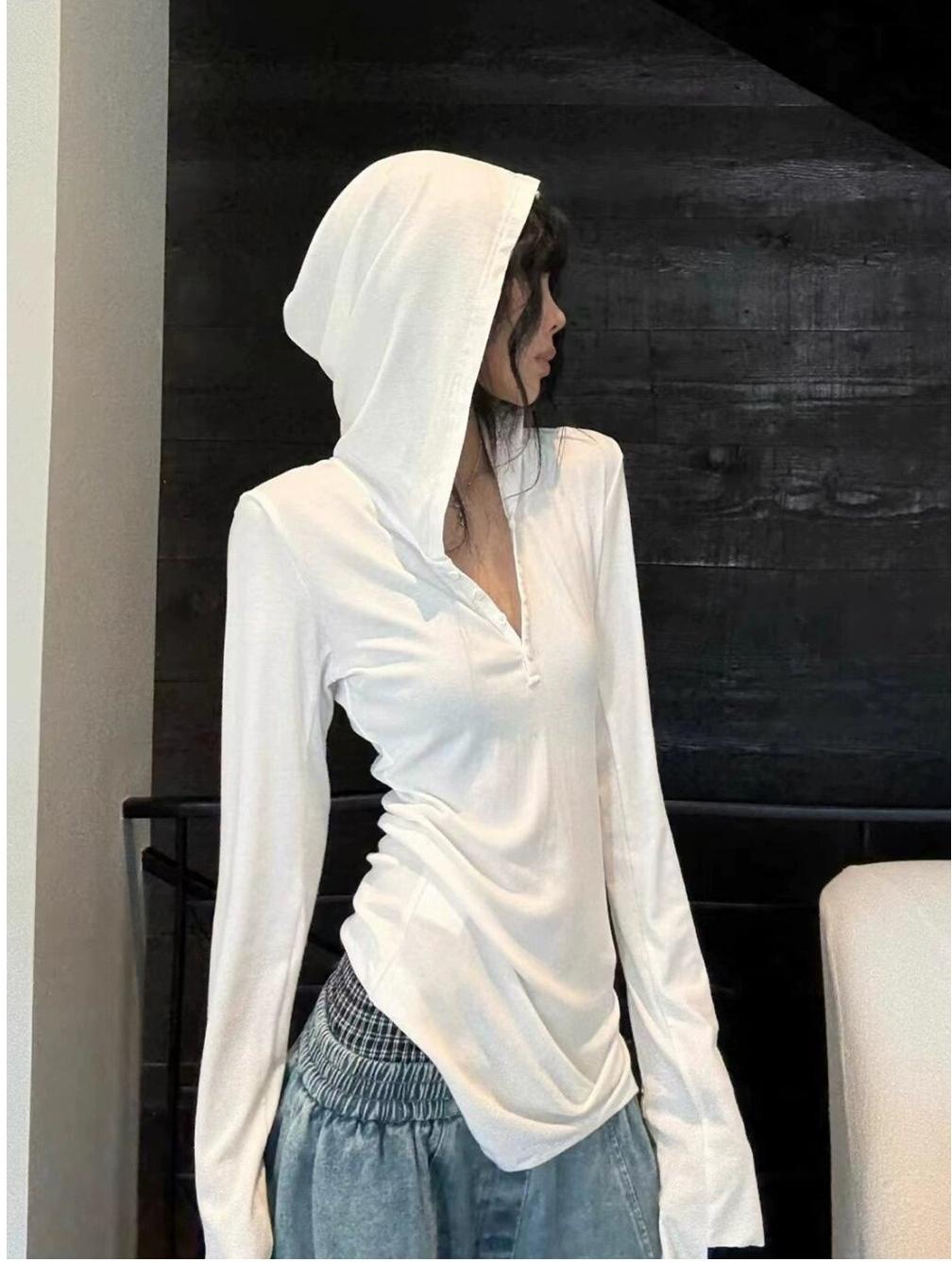 - Top: Slim-fit long sleeve tee with hood and classic Henley neckline in crisp white, soft cotton blend fabric.