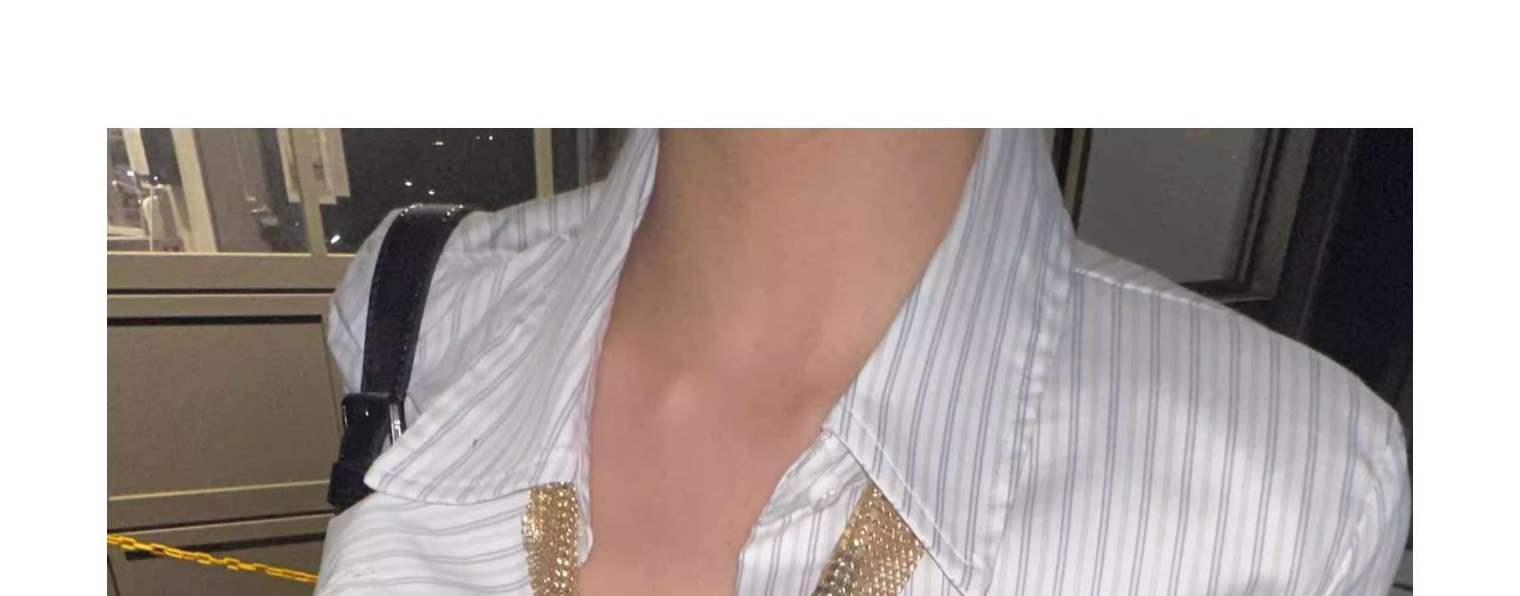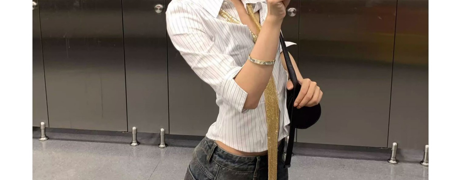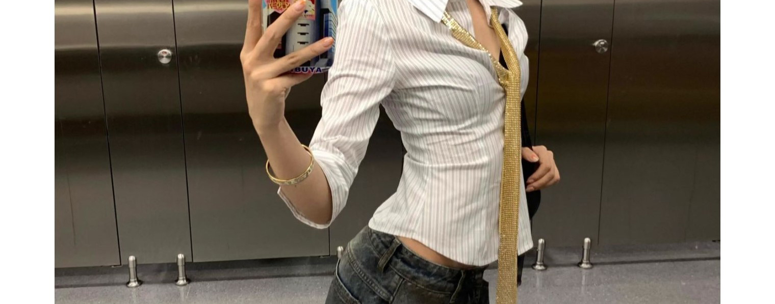 - Top: Mid sleeve striped shirt, slim fit, structured collar, casual American chic style.