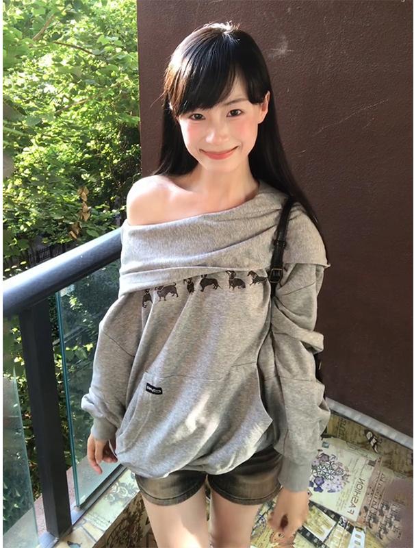 - Top: Loose-fit off-shoulder hoodie with dachshund print, soft autumn fabric, pullover style.