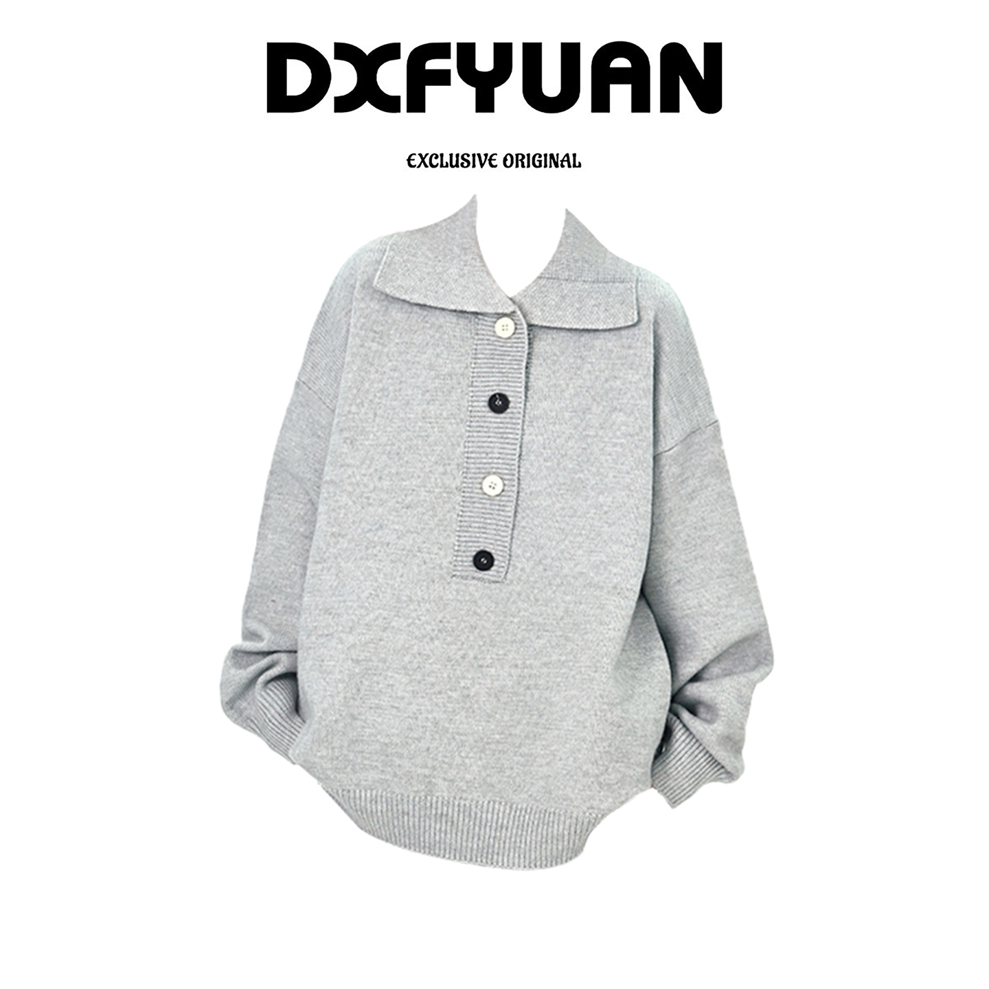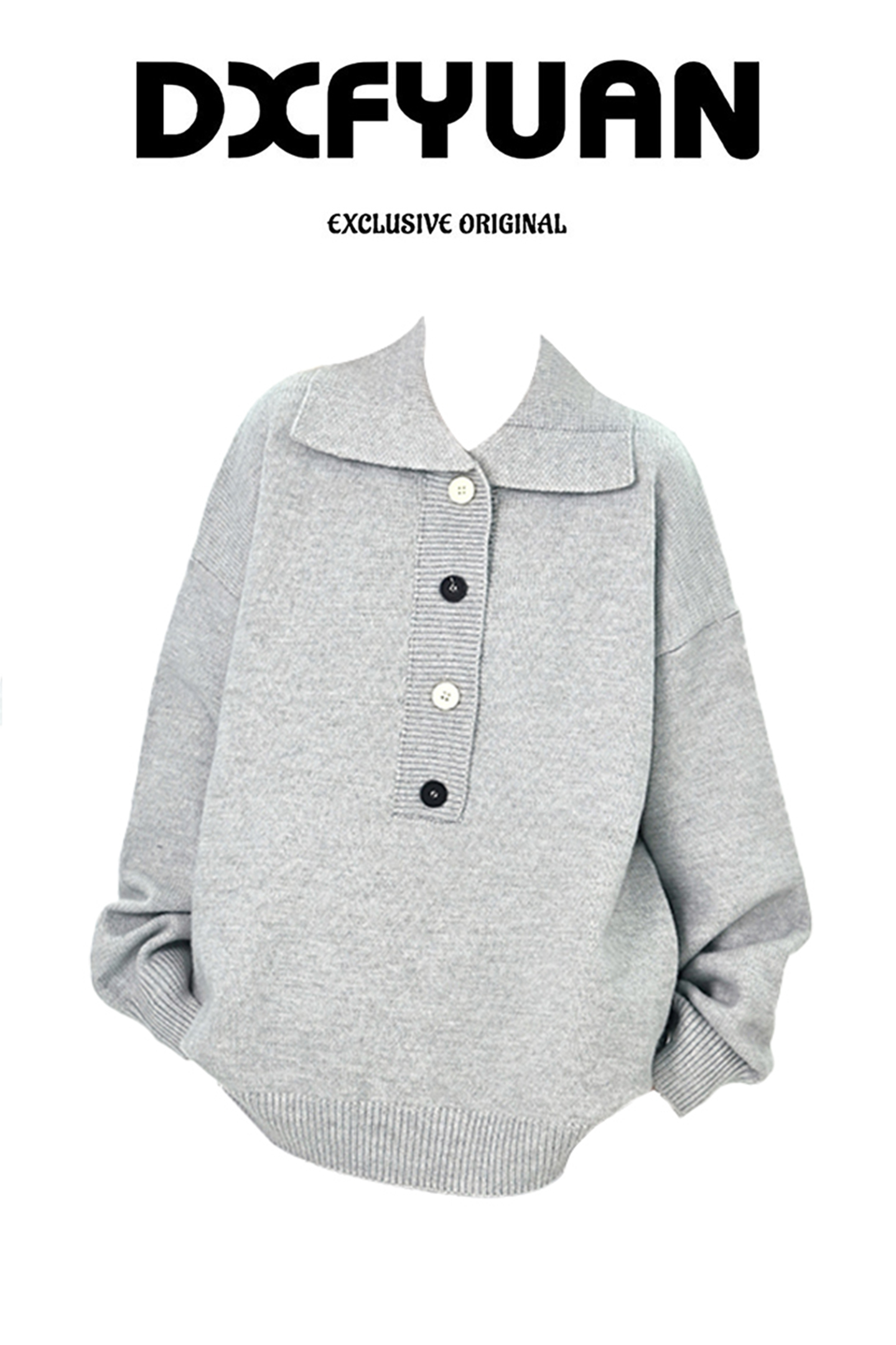 - Top: Loose-fit Henley knit sweater with soft grey fabric, cozy and breathable for early autumn.