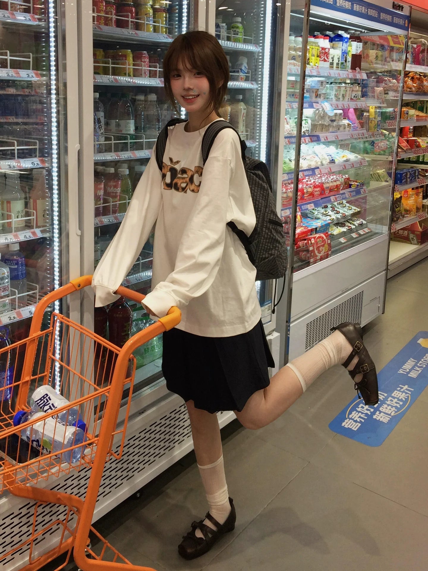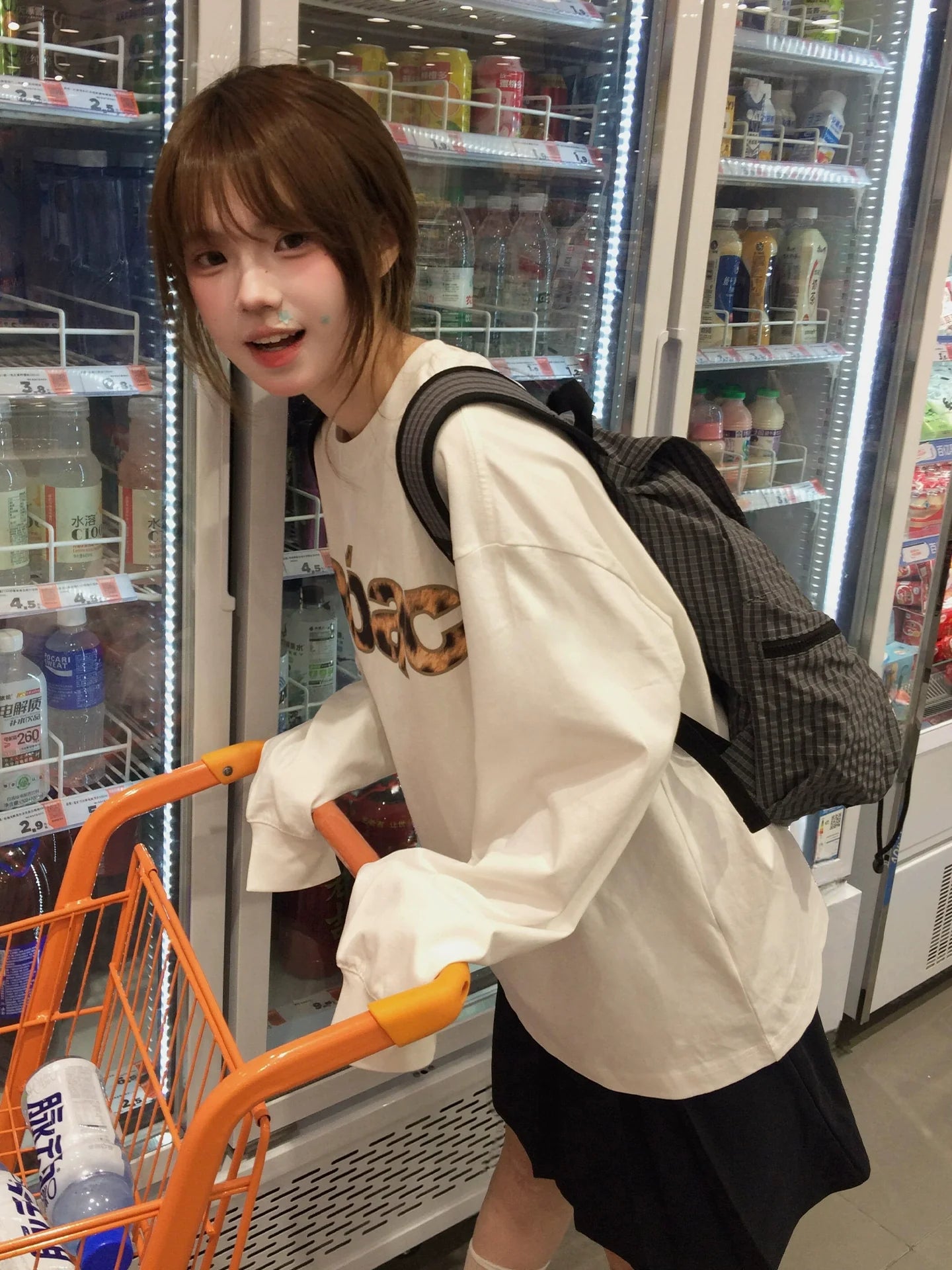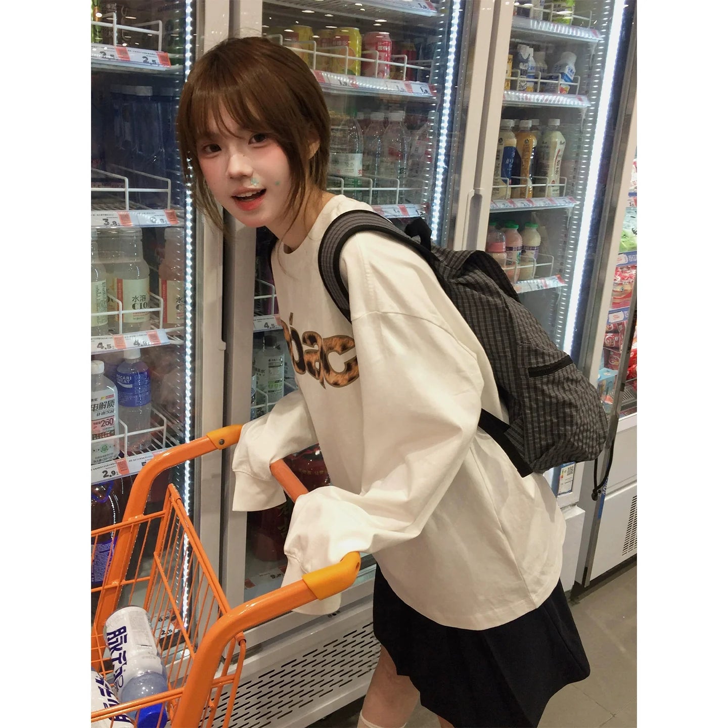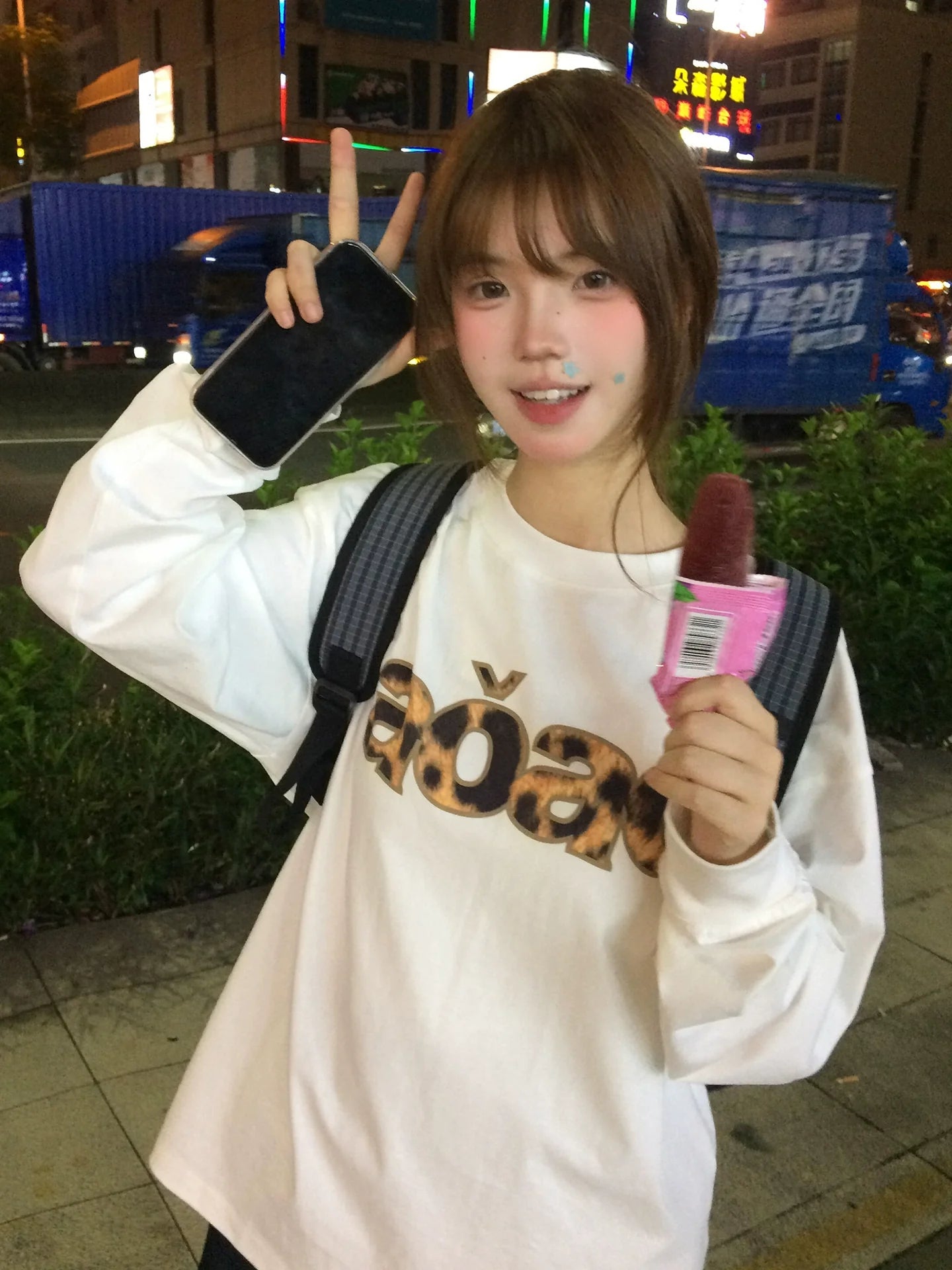 - Top: Autumn long sleeve tee with leopard and letter print, loose fit, soft cotton fabric, retro American aesthetic, versatile styling.