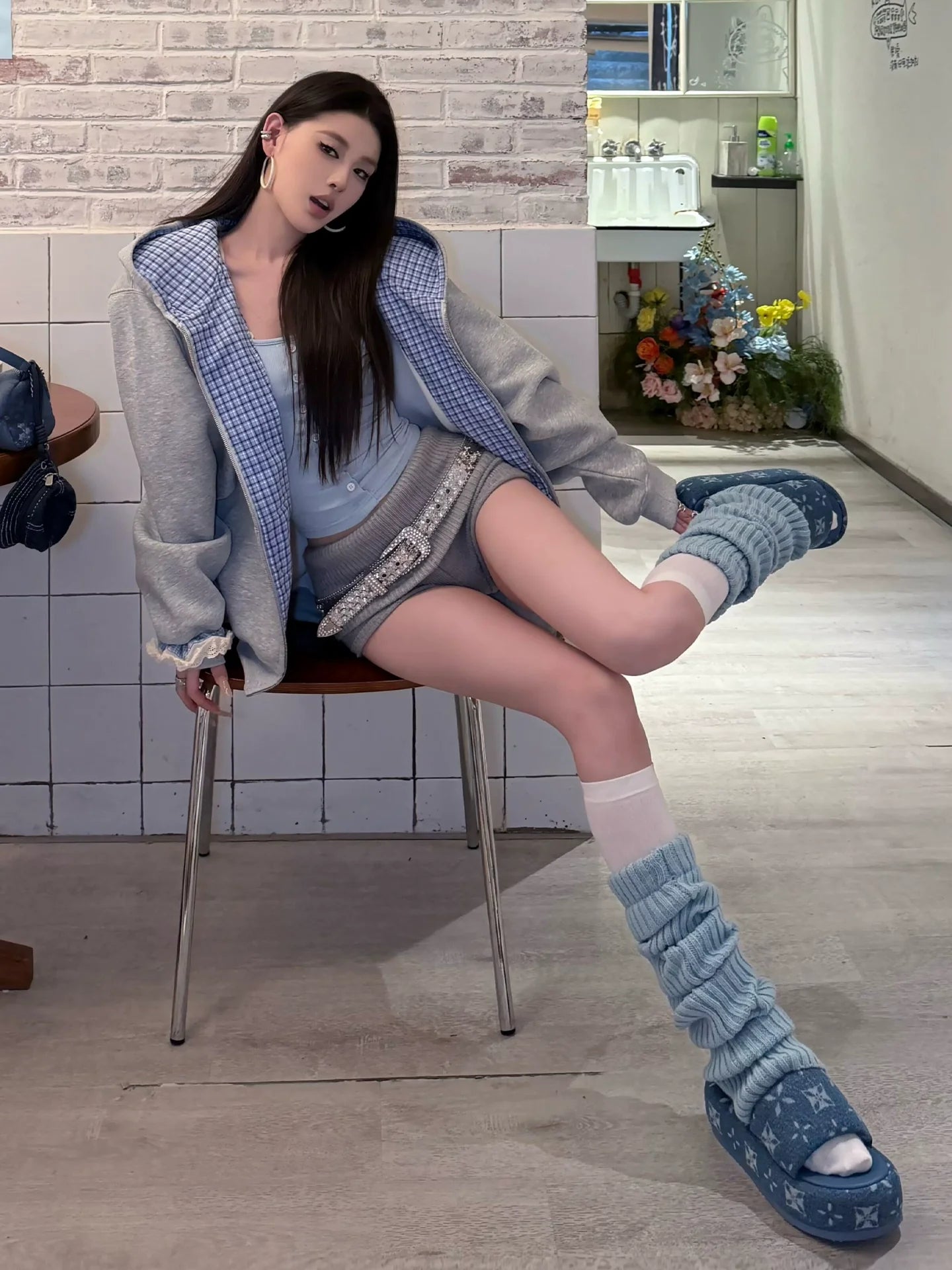 - Top: Plaid patchwork hoodie jacket, air-layer warm fabric, zip-up design, loose fit with vintage American retro streetwear feel.