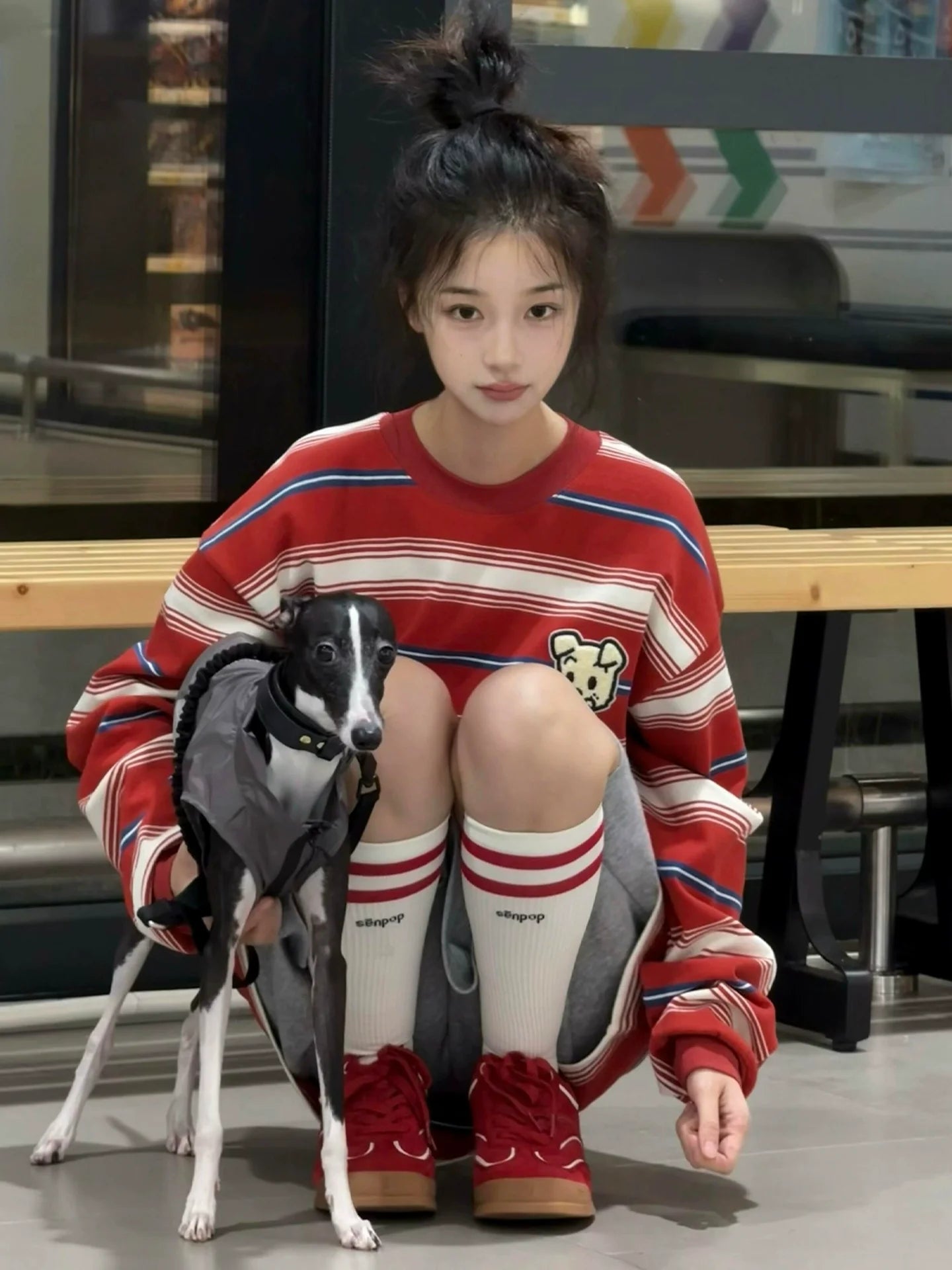 - Top: Classic red stripe long sleeve sweatshirt with soft cotton fabric, relaxed crewneck, and vintage collegiate feel.
