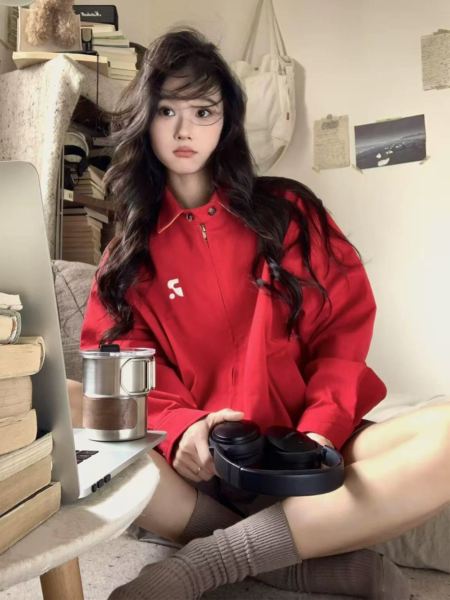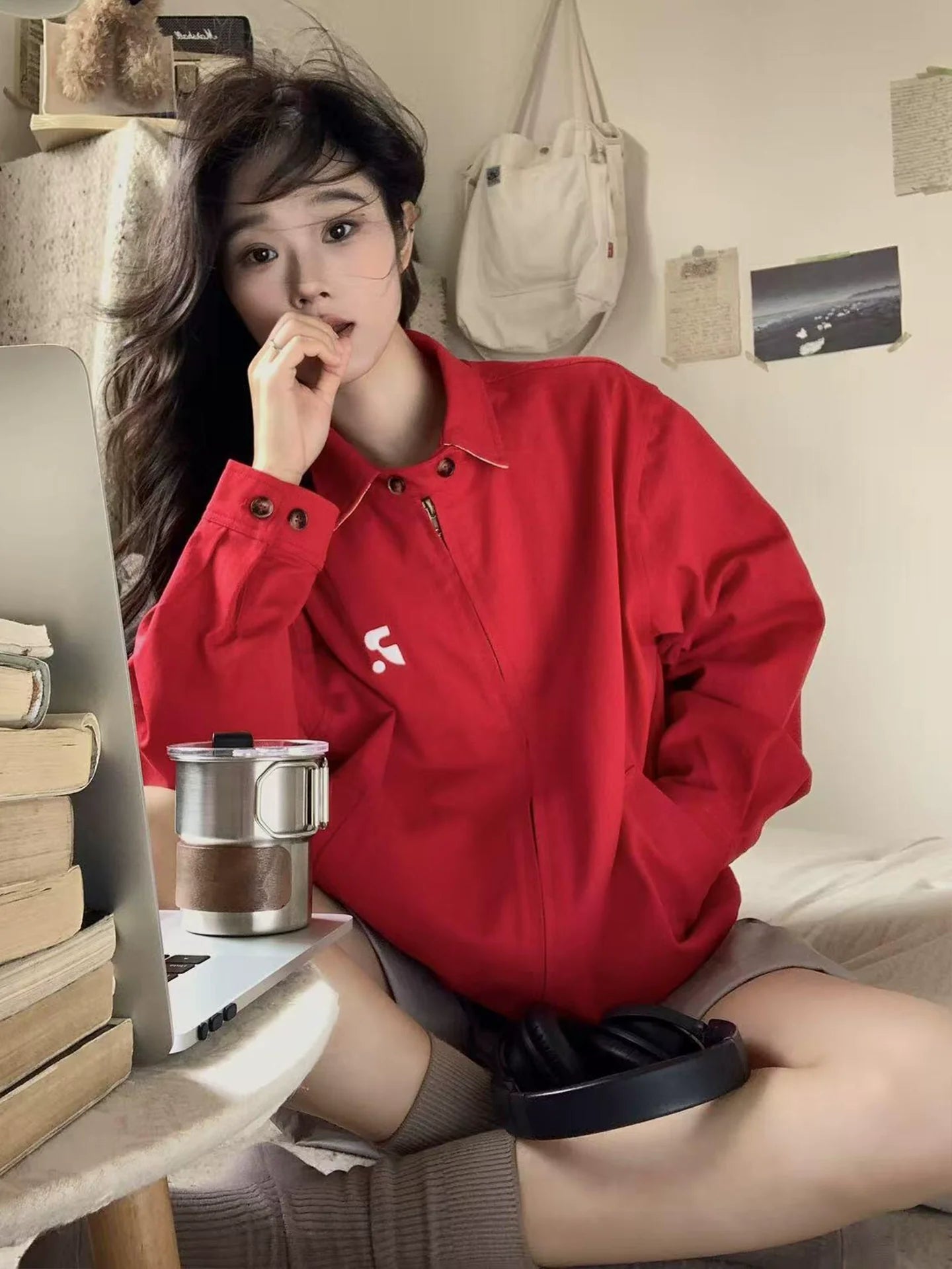 - Top: Lightweight red zip-up jacket with vintage American design, unisex fit.