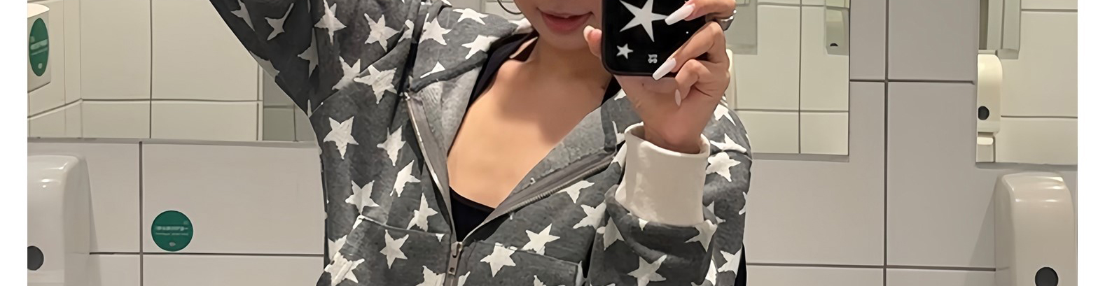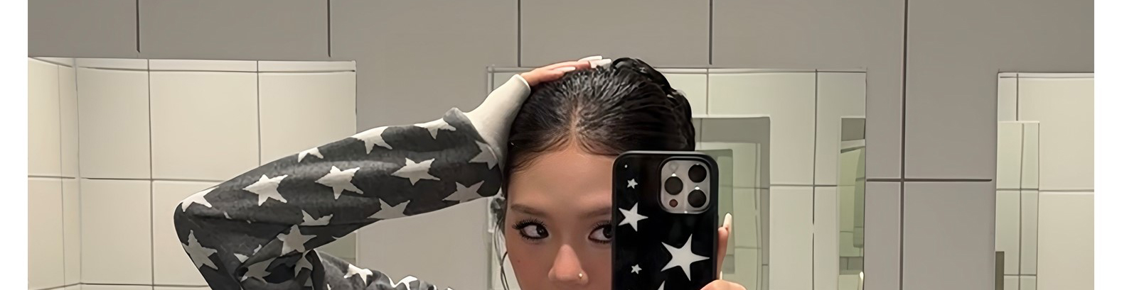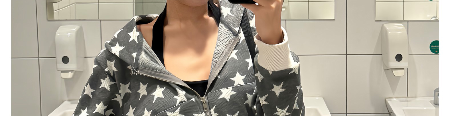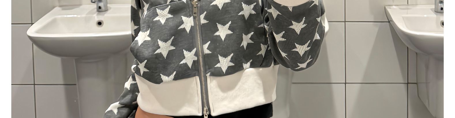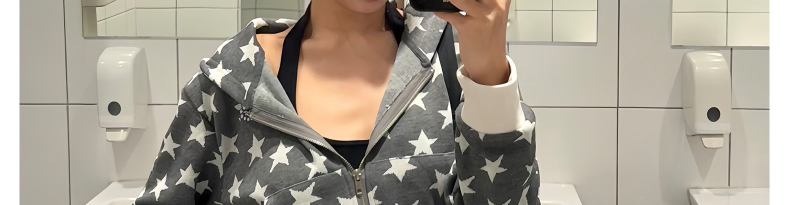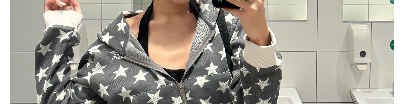 - Top: Loose-fit cropped hoodie with star print, casual early autumn fabric, soft and breathable.