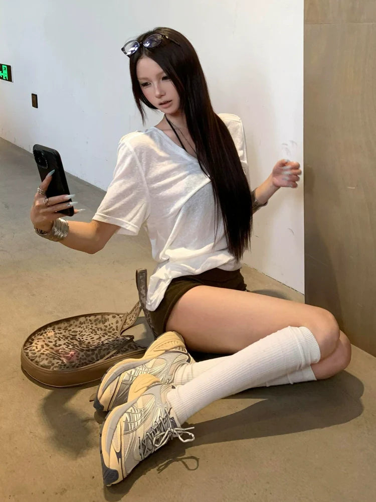 - Top: White V-neck tee made with snow cotton fabric, soft drape and breathable feel for effortless comfort.