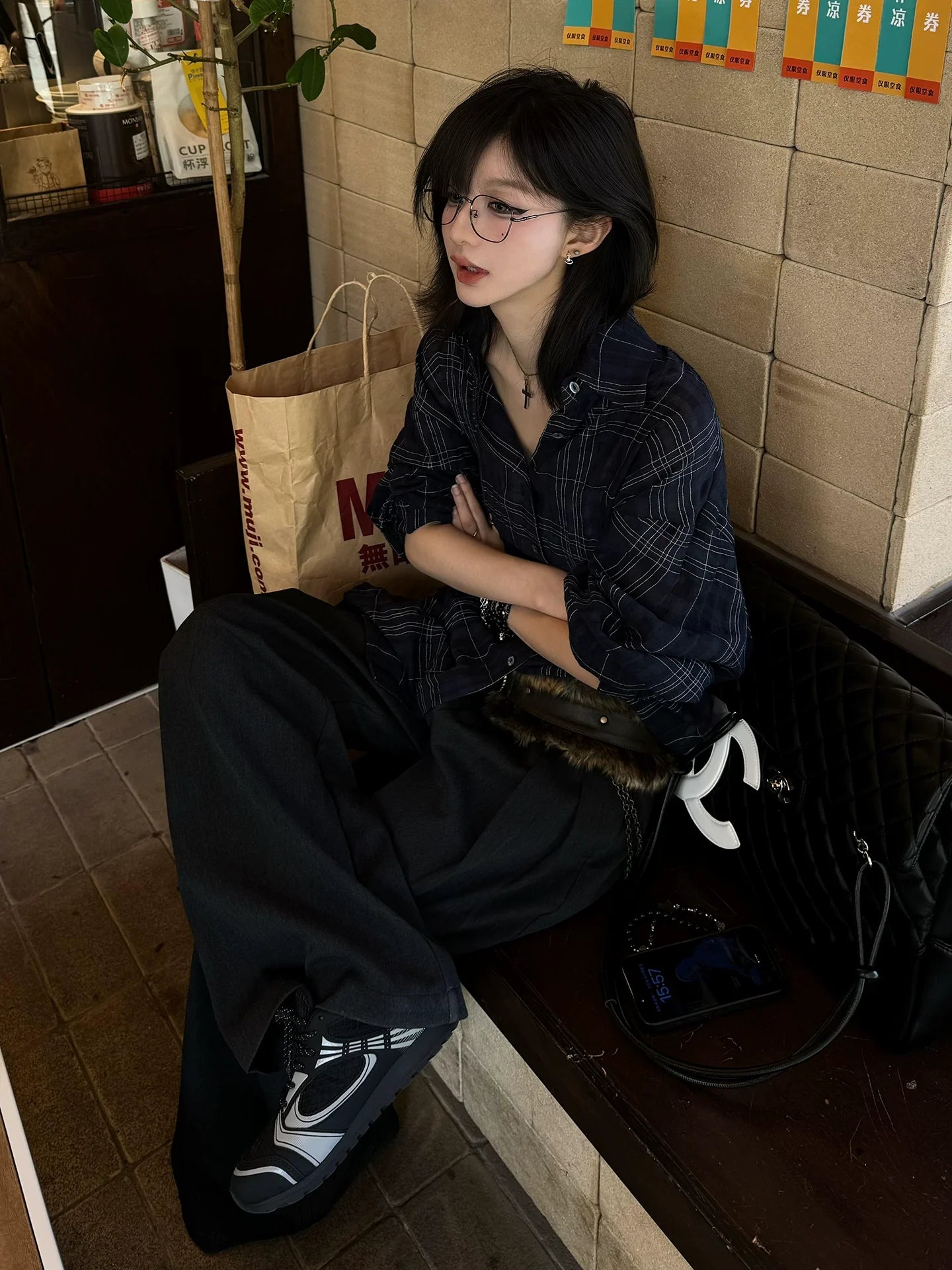 - Top: Lightweight semi-sheer plaid shirt with asymmetric hem, button-up front, and relaxed silhouette.
