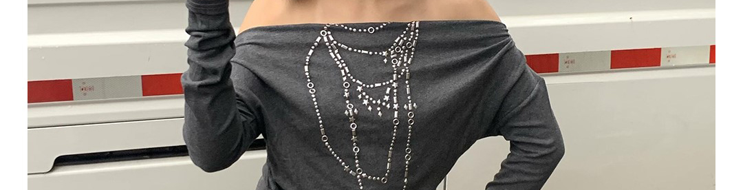 Trendy off-shoulder tee with creative graphic print. Sexy and stylish baddie vibe for early autumn outfits.