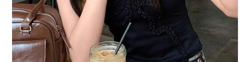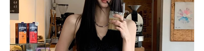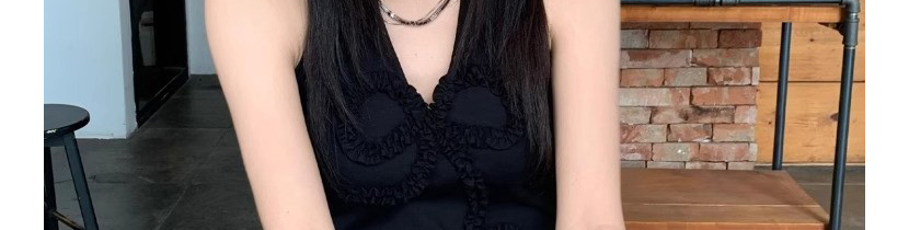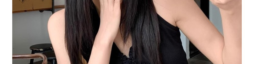 - Top: Black halter top with V-neck, bow, and ruched details, sleeveless, slim fit.