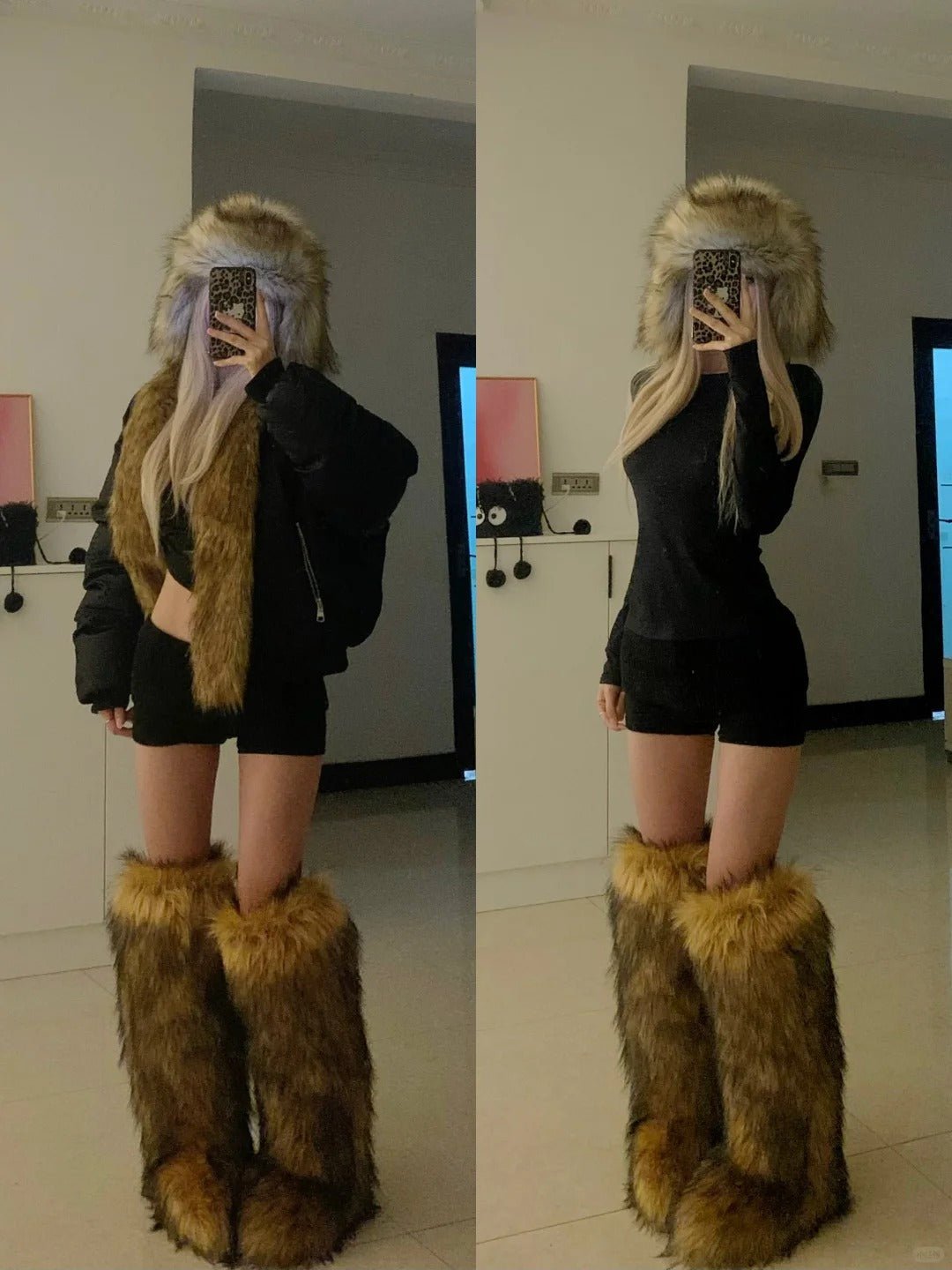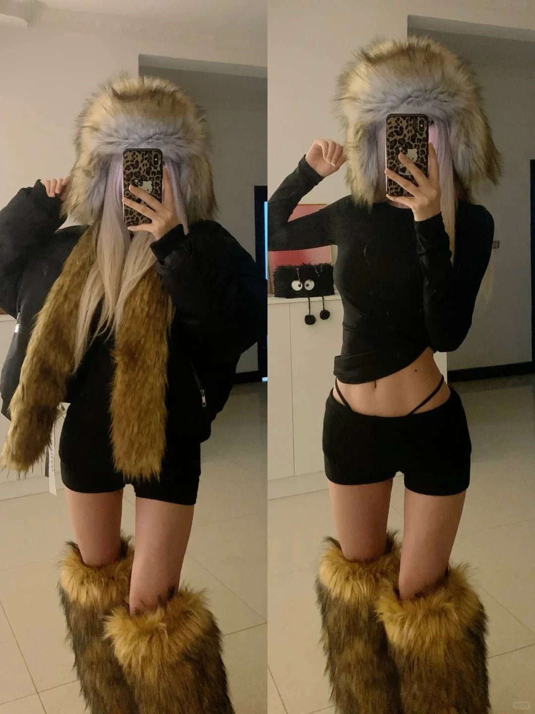 - Outerwear:Short black down jacket with open-front faux-fur texture, exuding street-edge Y2K attitude.