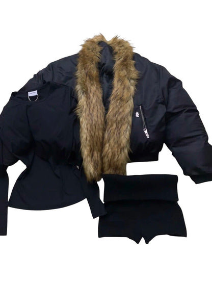 Black Furry Short Down Coat with Top and Shorts Y2K Three-Piece Set