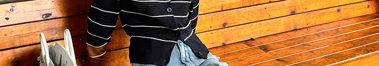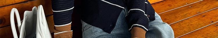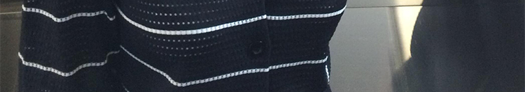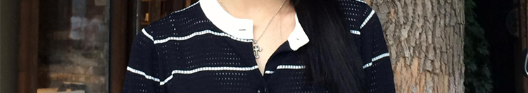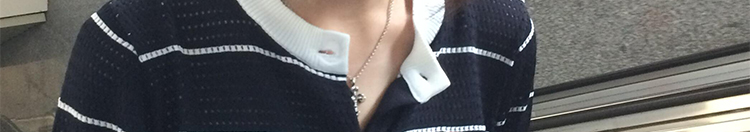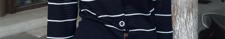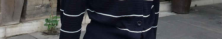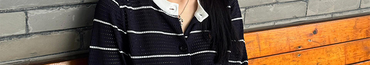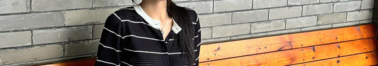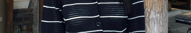 - Cardigan: Slim-fit knit cardigan with black lattice pattern, colorblock stripes, round neck, soft autumn fabric.