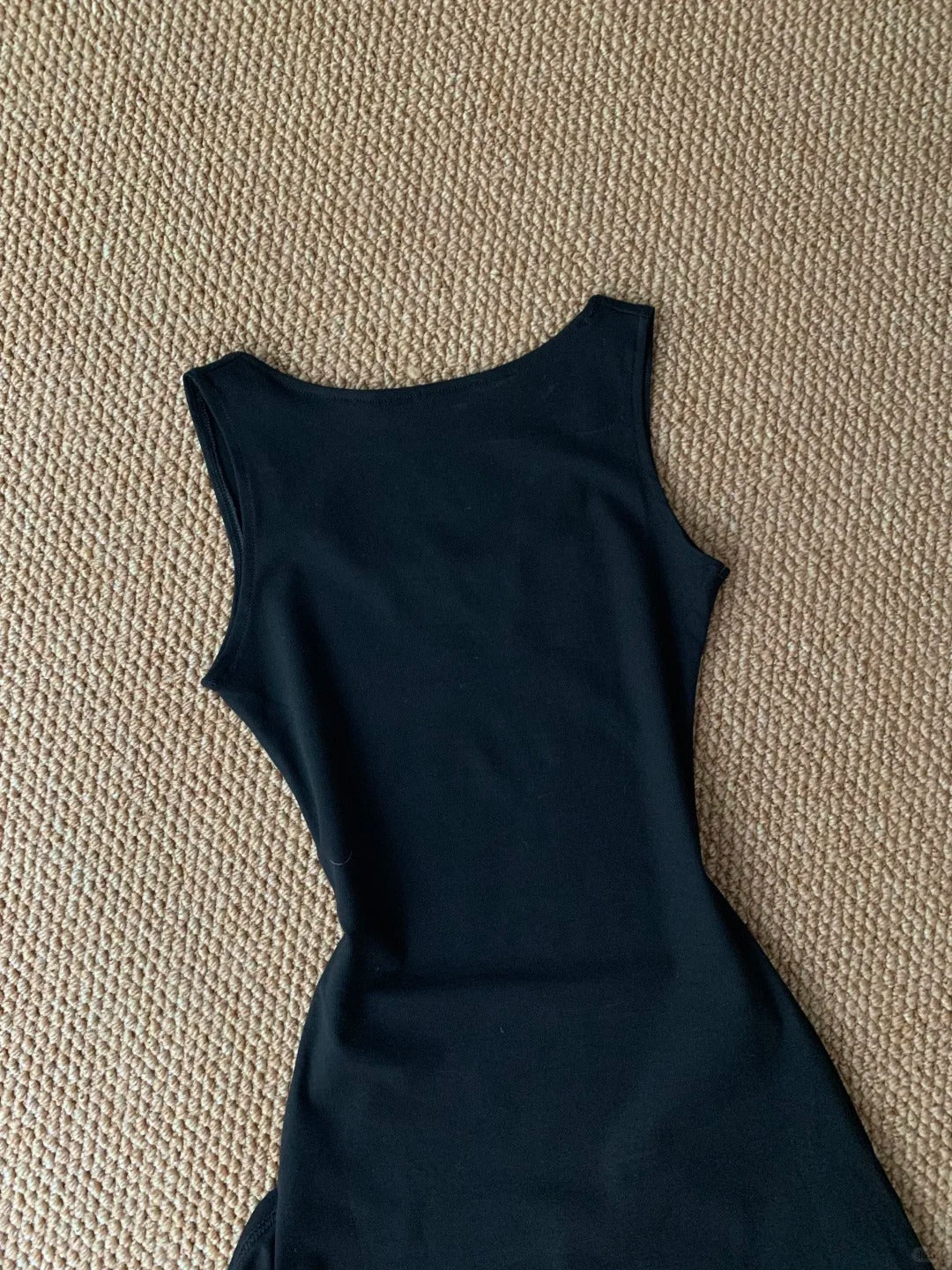 - Dress: Black tank mini dress with bold letter print and asymmetric cut, channeling edgy Y2K vibes.