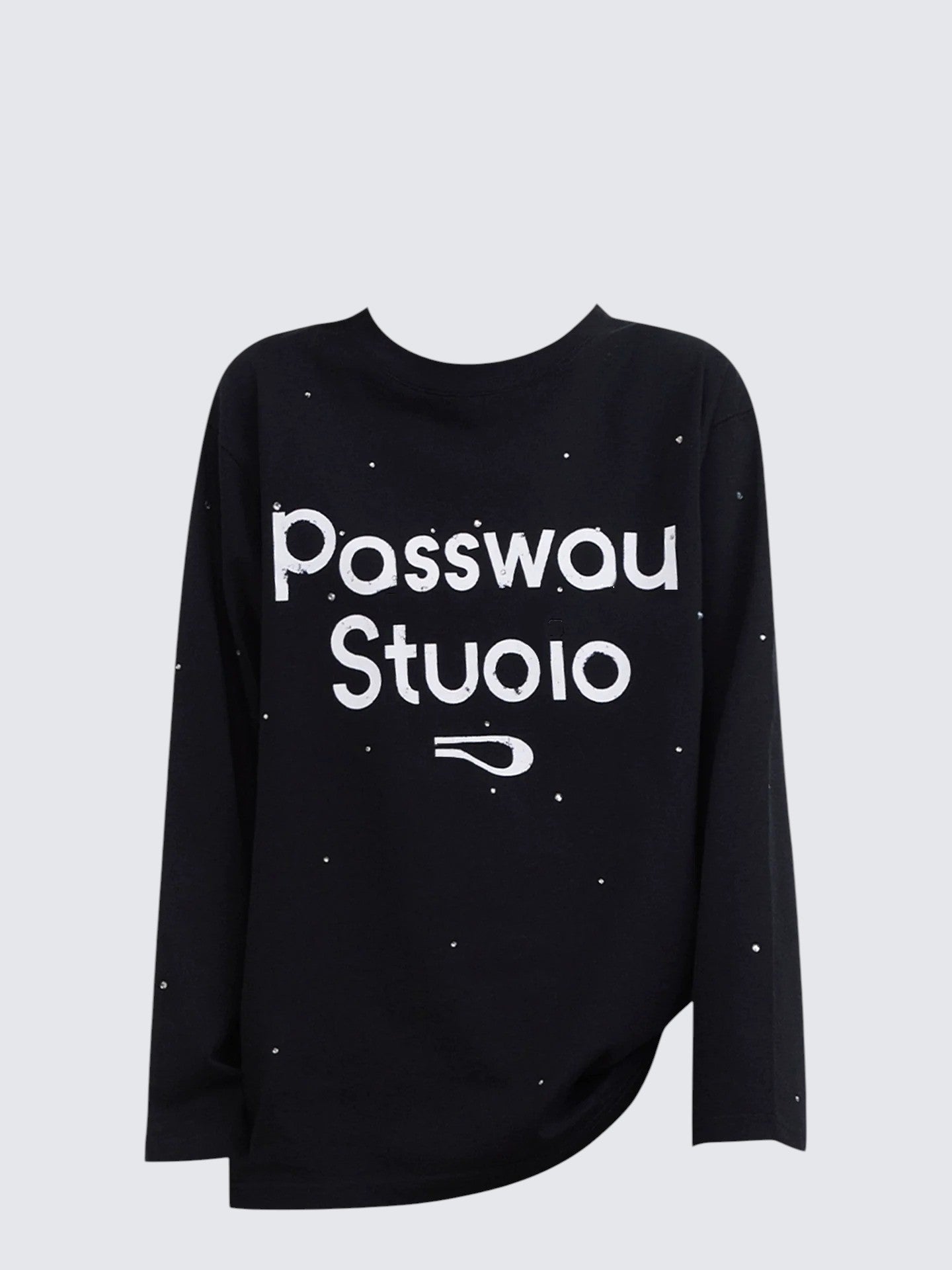 Retro black long sleeve tee with letter print. Loose fit, casual and versatile for autumn layering.