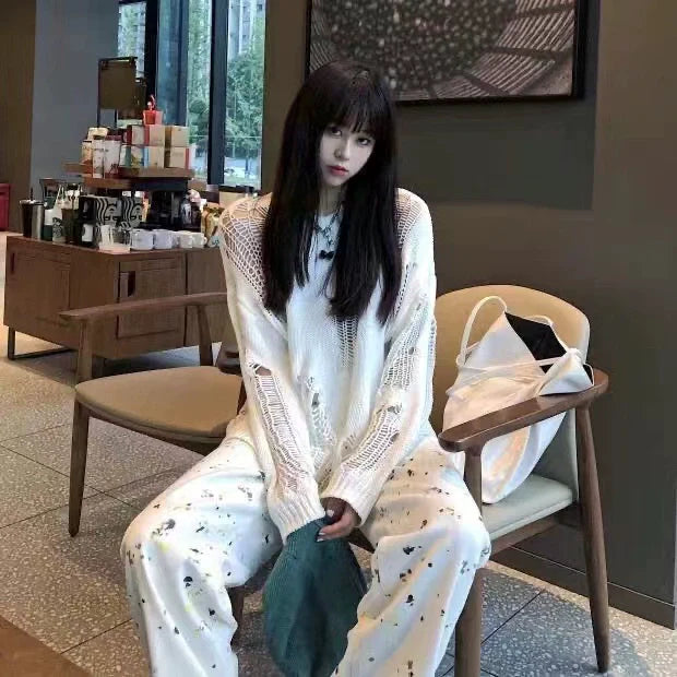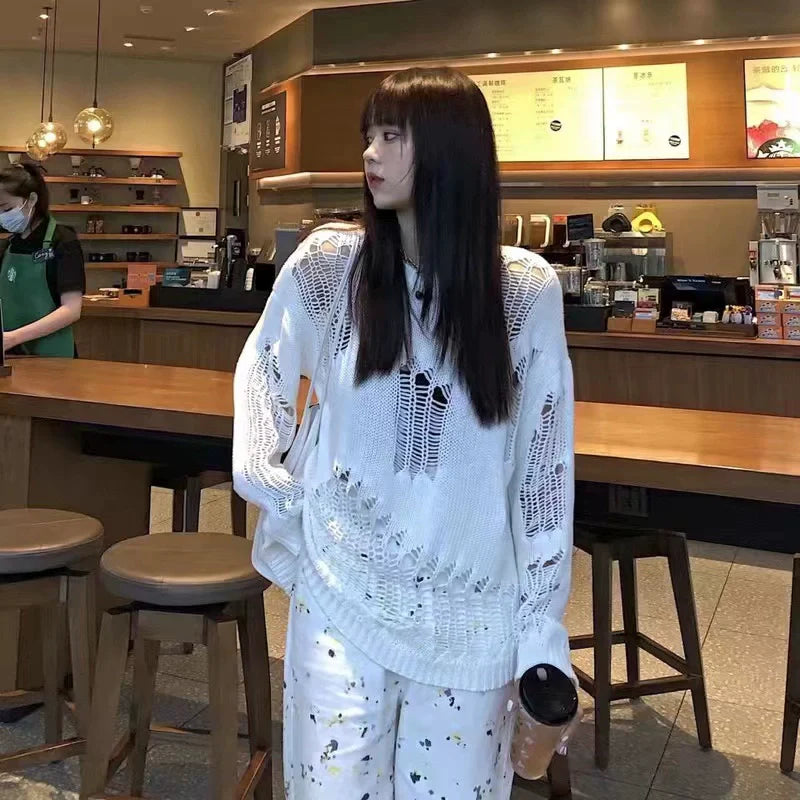 - Top: Thin, loose-fit slouchy top with cutout () and distressed details, blending punk and Y2K subculture. (casual slouchy vibe) for summer or layering.