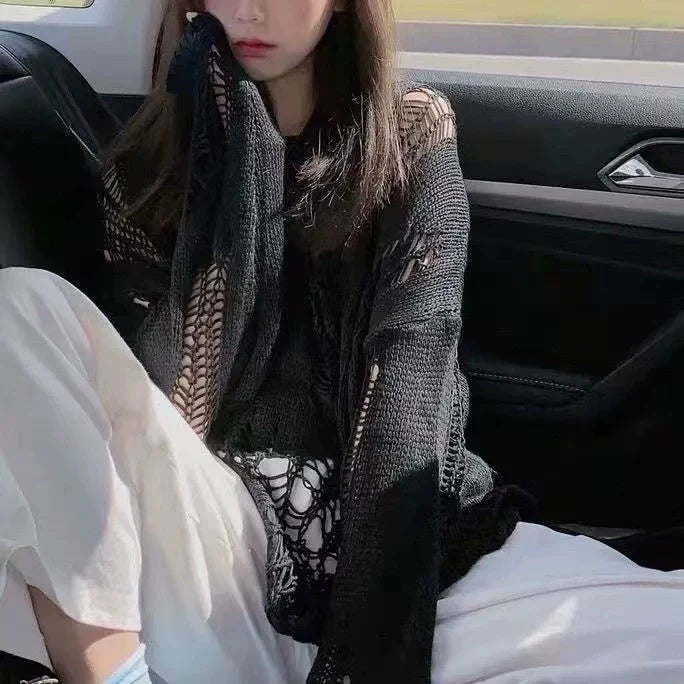 Black Subculture Punk Y2K E-girl Cutout & Distressed Slouchy Oversized Top (Thin Fabric)