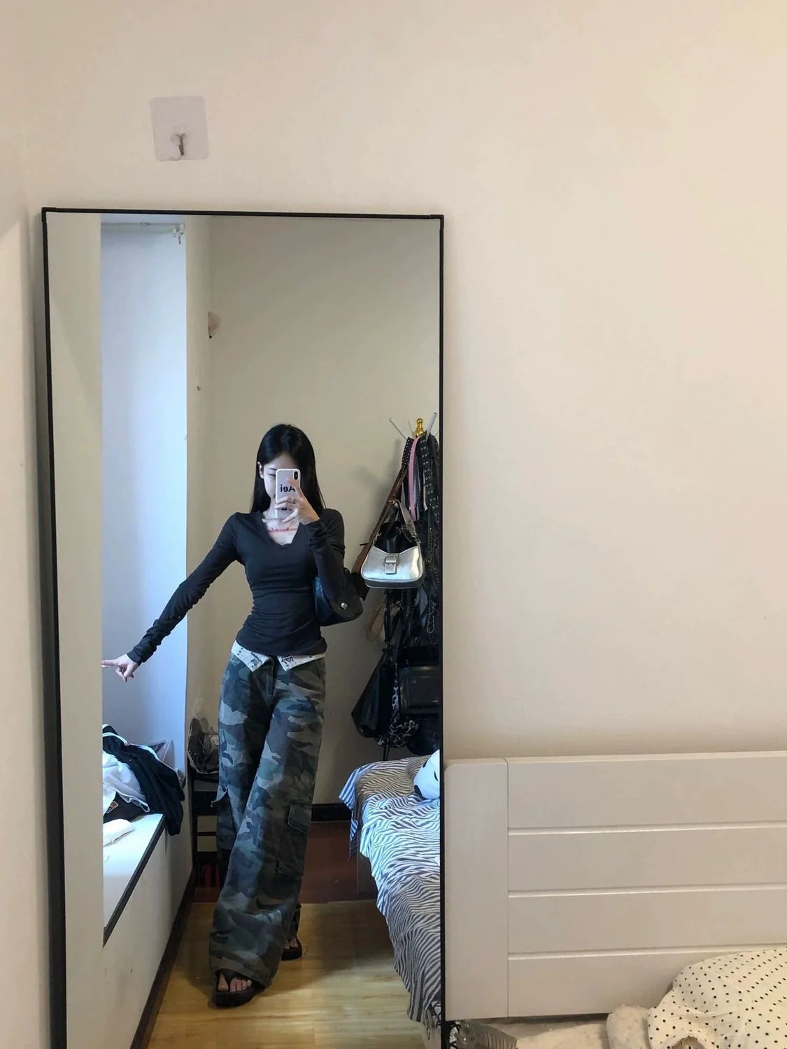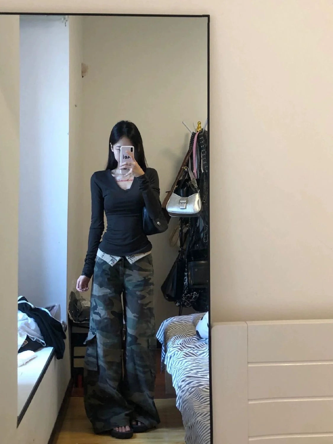 - Top: Black thin long-sleeve T-shirt with vintage open-back design and V-neck, featuring a slim fit that flatters the figure, ideal for Y2K subculture summer-to-fall styling.