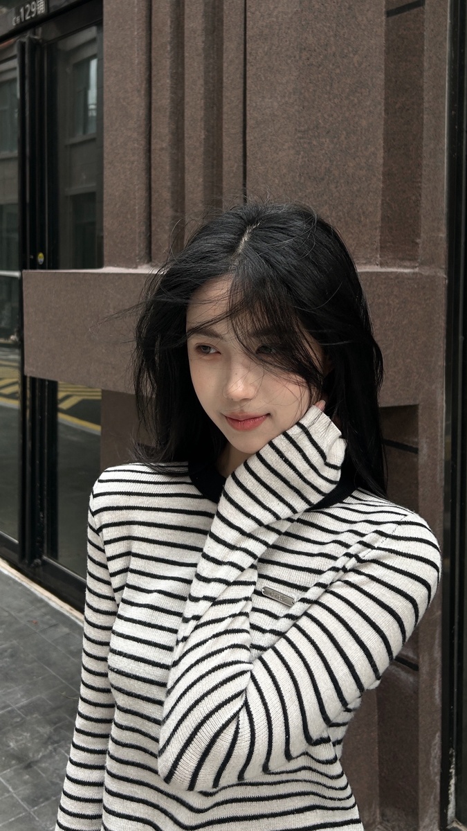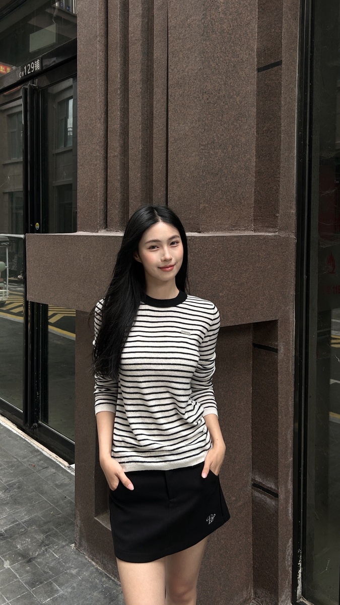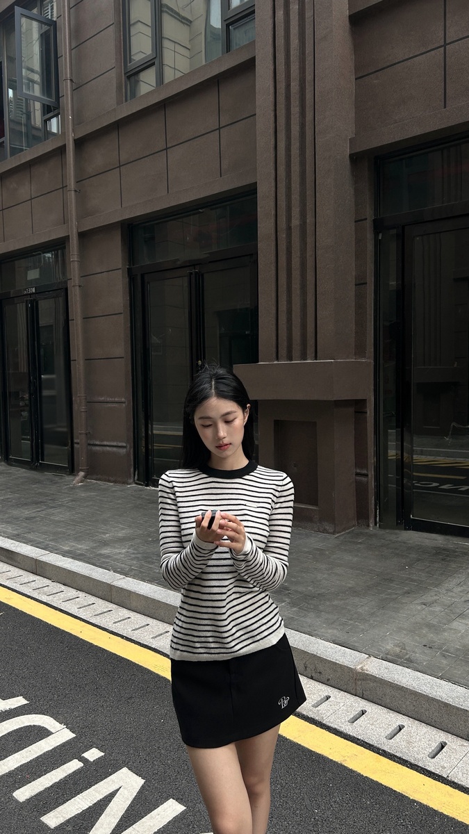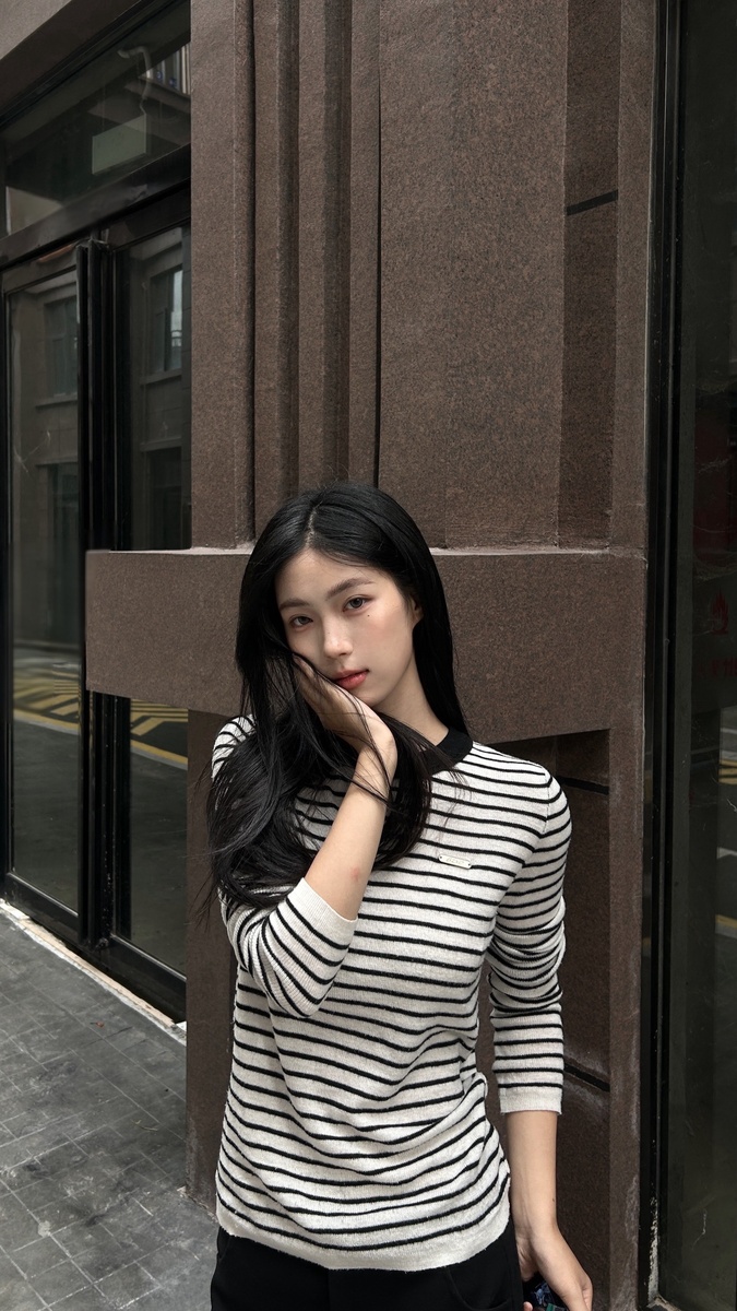 - Top: Slim-fit long sleeve knit sweater with black and white stripes, soft autumn fabric, comfortable and cozy.