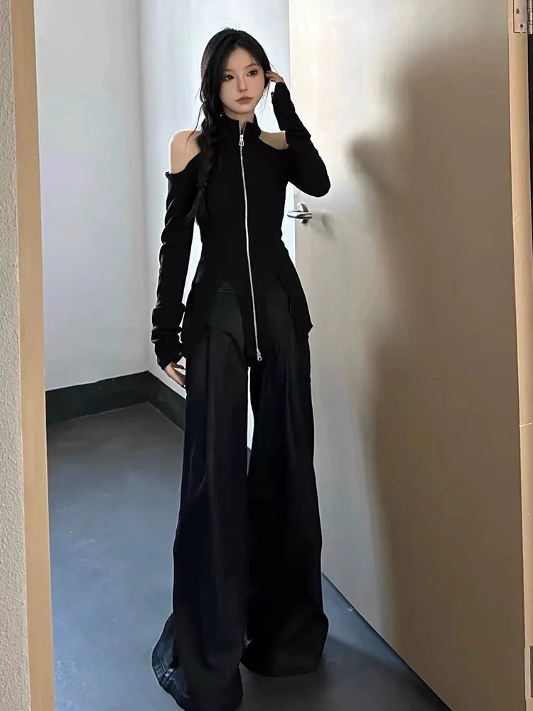- Cardigan: Black long-sleeve knit cardigan with Y2K subculture vibe, featuring halter and off-shoulder design—design-forward piece ideal for autumn.