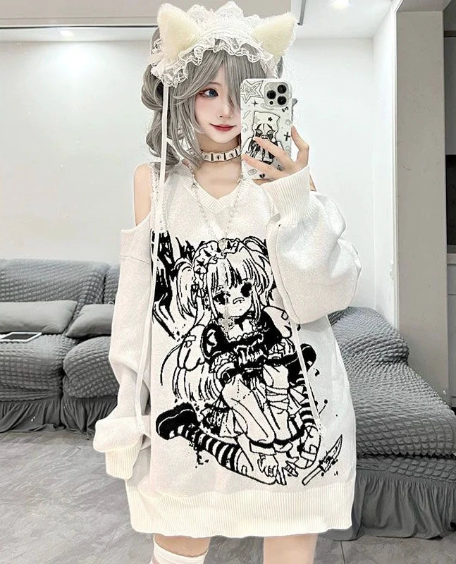 - Look: An edgy cozy piece ideal for punk streetwear, casual outings, or winter looks, balancing dark angel graphics with off-shoulder flair and soft knit fabric.