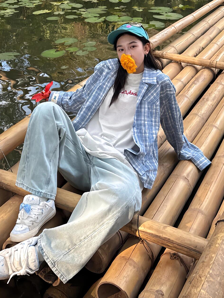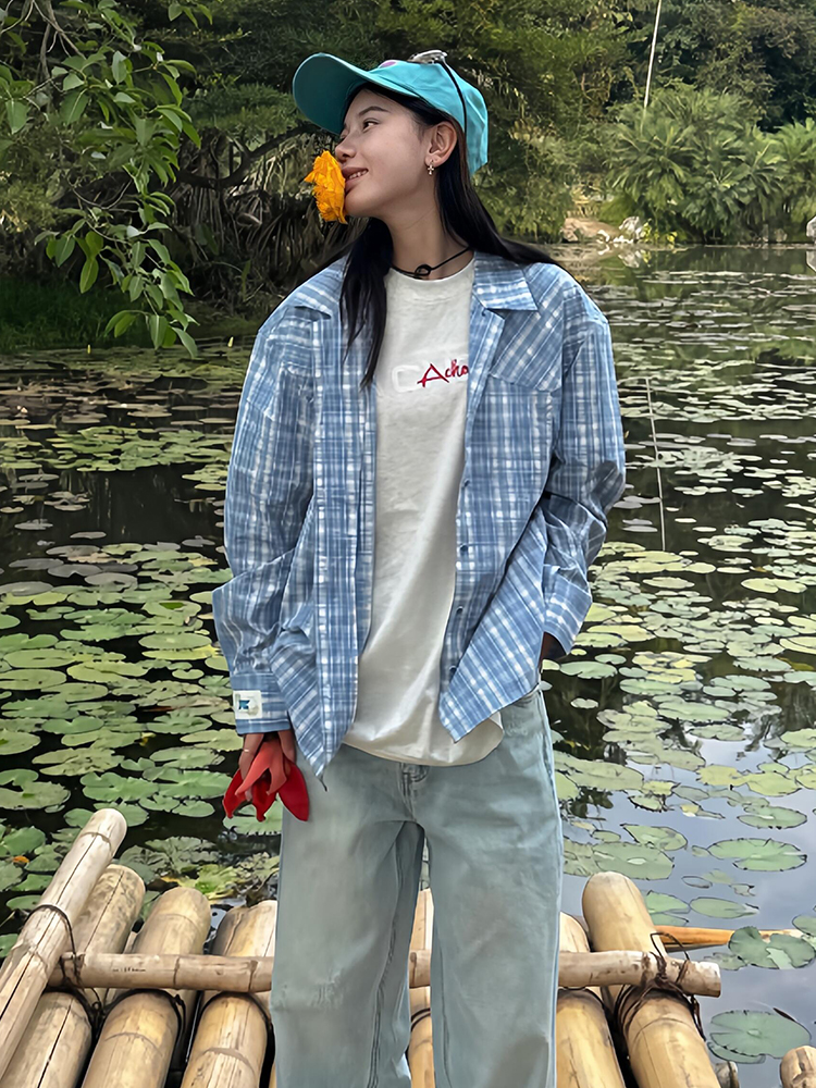 - Top: Loose-fit long sleeve shirt with blue plaid pattern and Cuban collar, lightweight autumn fabric.