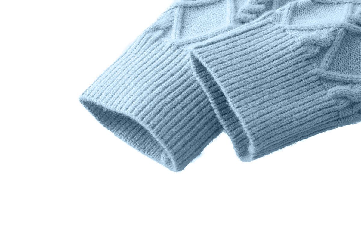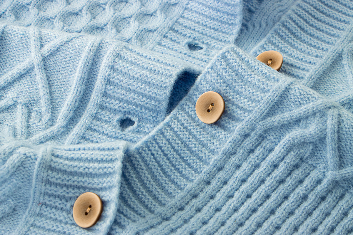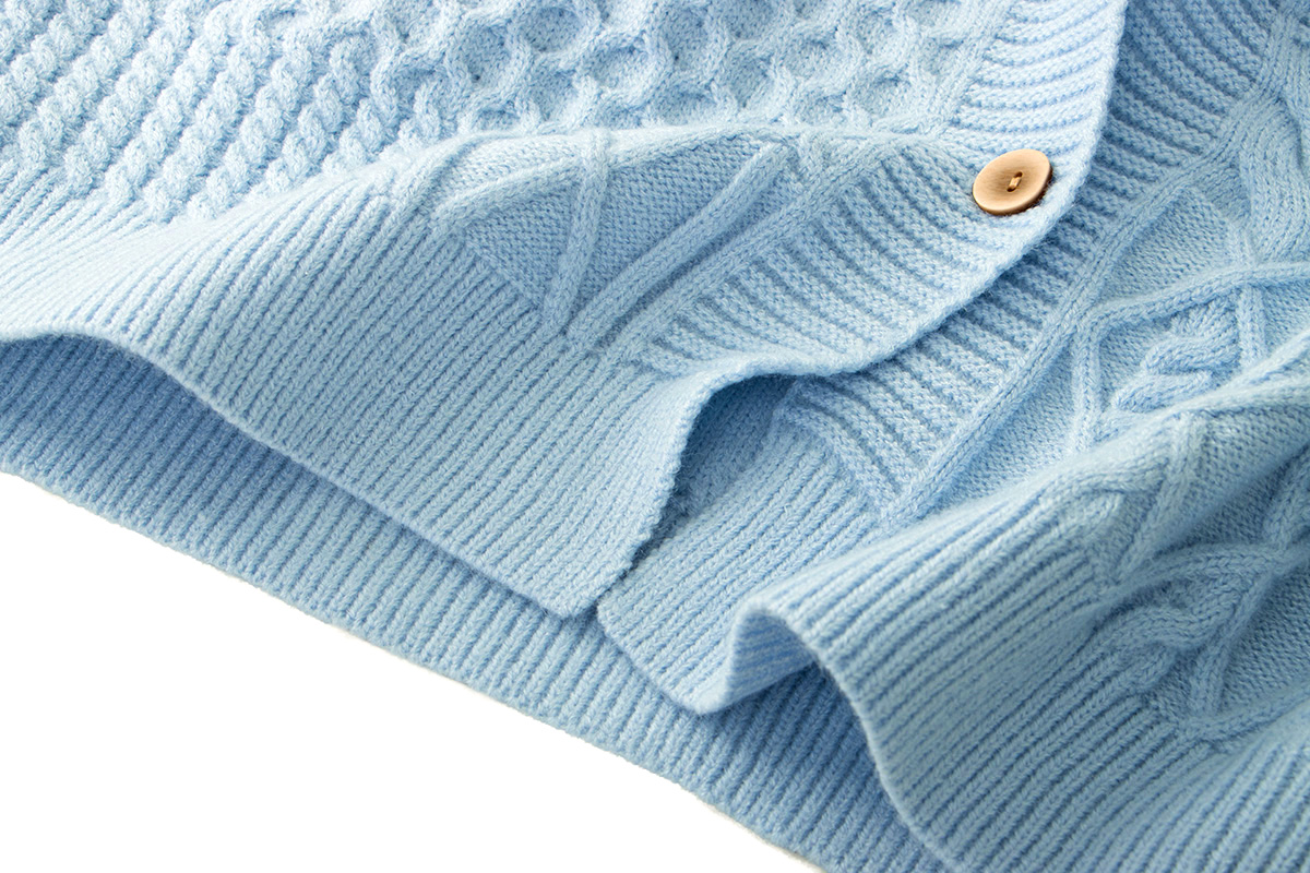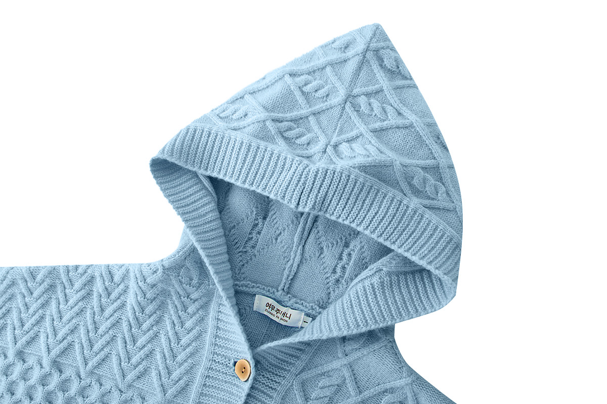 Blue knit cardigan with hood. Mid-length, thick and cozy for autumn and winter layering.