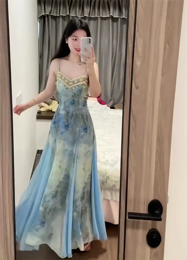- Dress: Slip dress featuring blue ombre print with delicate lace trim, lightweight and soft fabric, and flowing silhouette.
