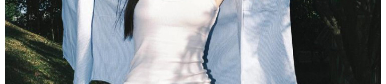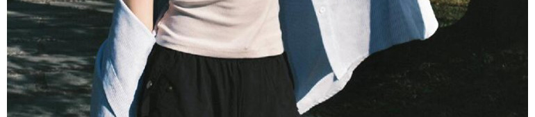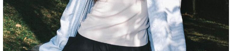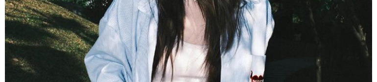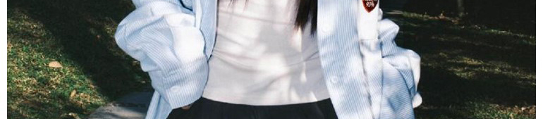 - Top: Oversized blue striped shirt with long sleeves, lightweight spring fabric, casual relaxed fit.