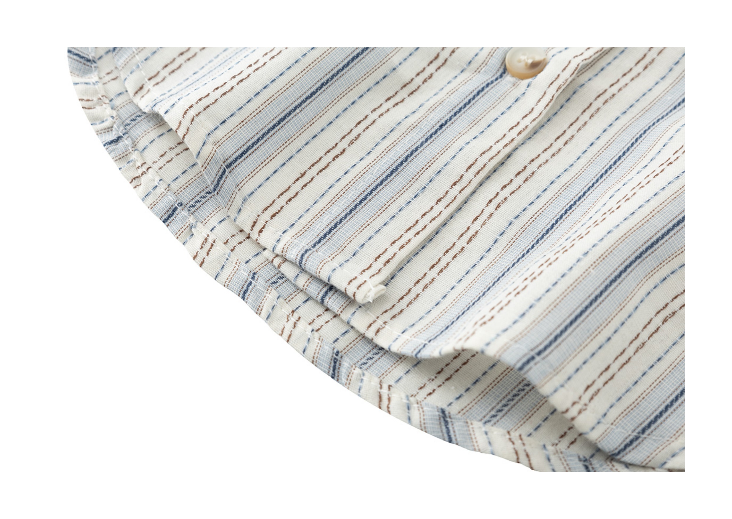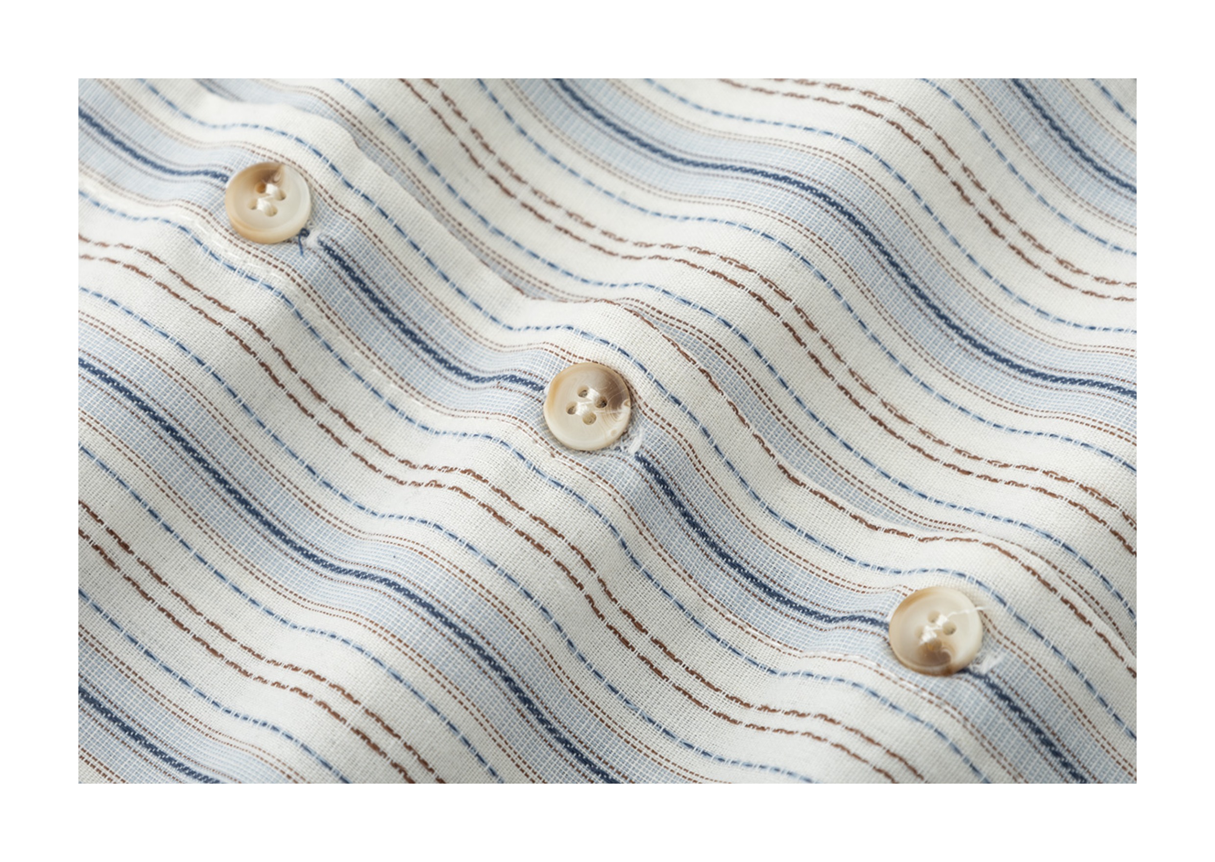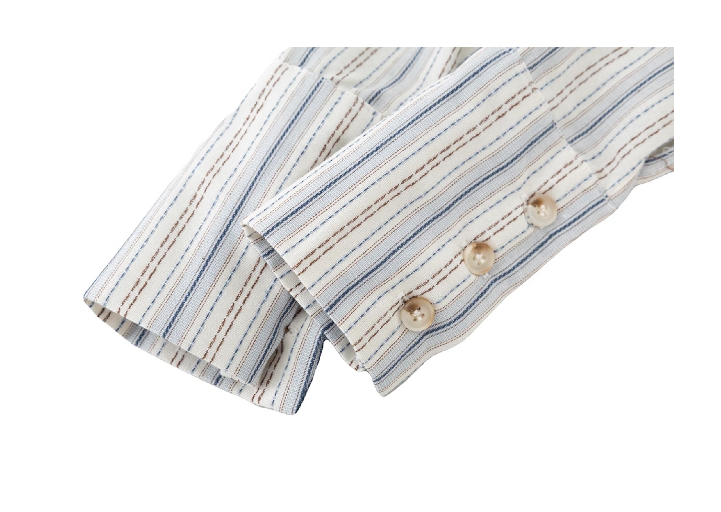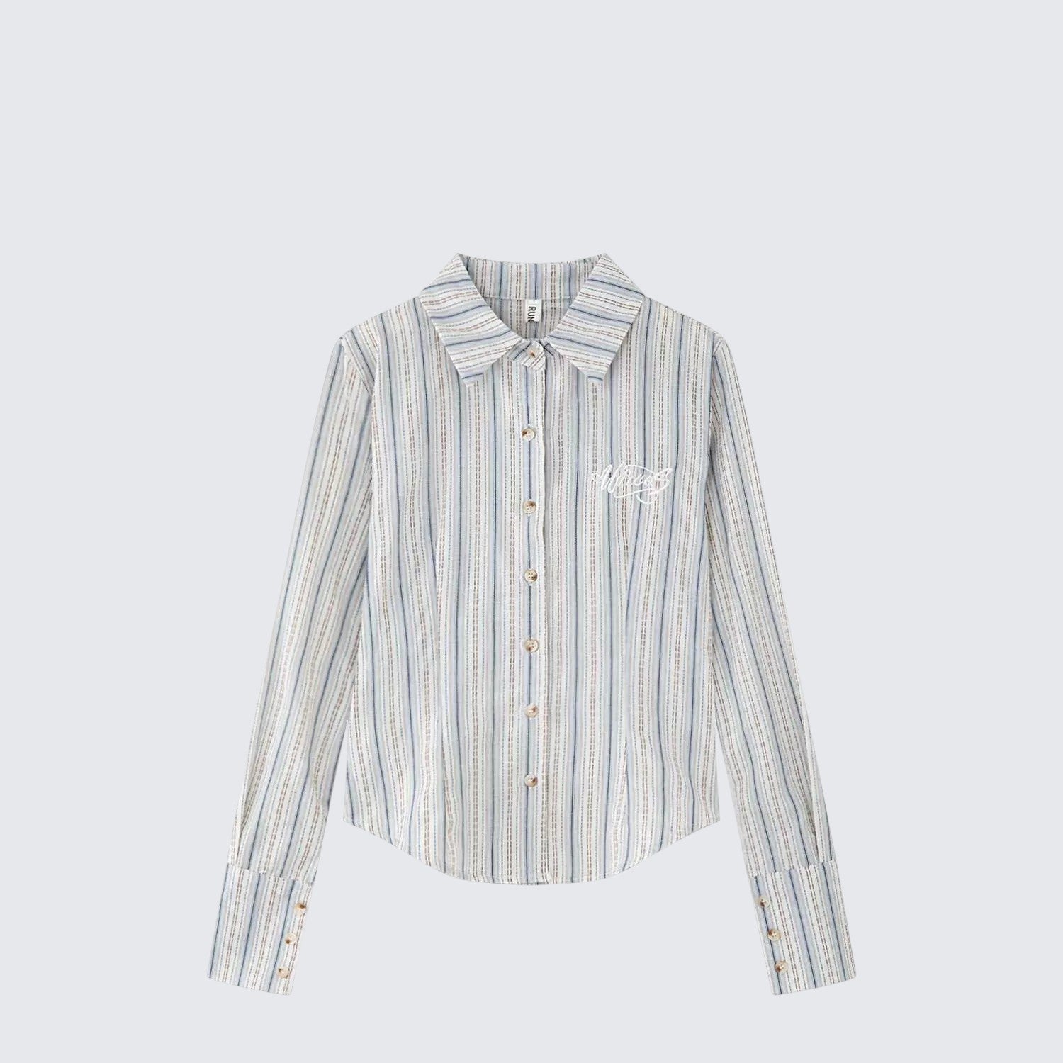 - Top: Blue striped button-up shirt with slim fit and cinched waist for a flattering silhouette.