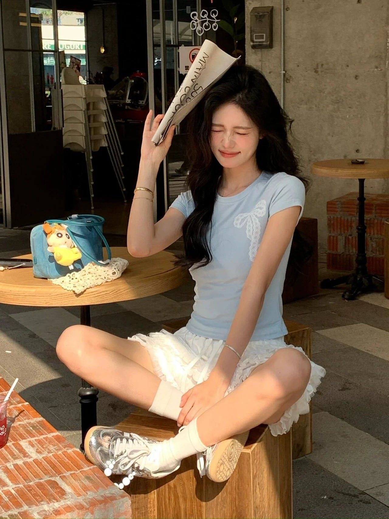 - Top: Soft 40s cotton tee with bow print, fitted silhouette, cropped hem and structured shoulders for a youthful Y2K girly style.