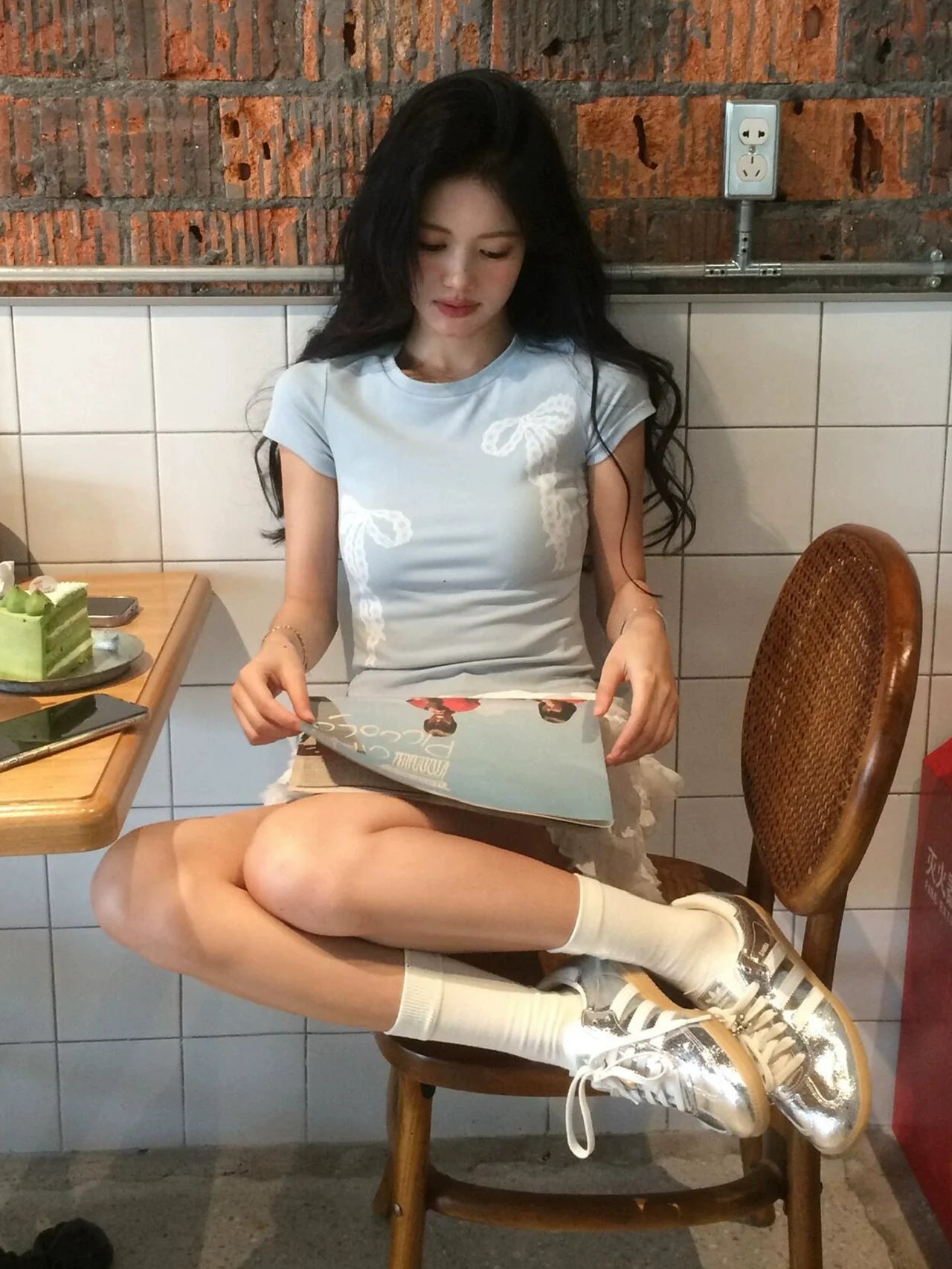 Bow Print Fitted Short Sleeve Tee Structured Shoulder Cotton Cropped Top Y2K Aesthetic