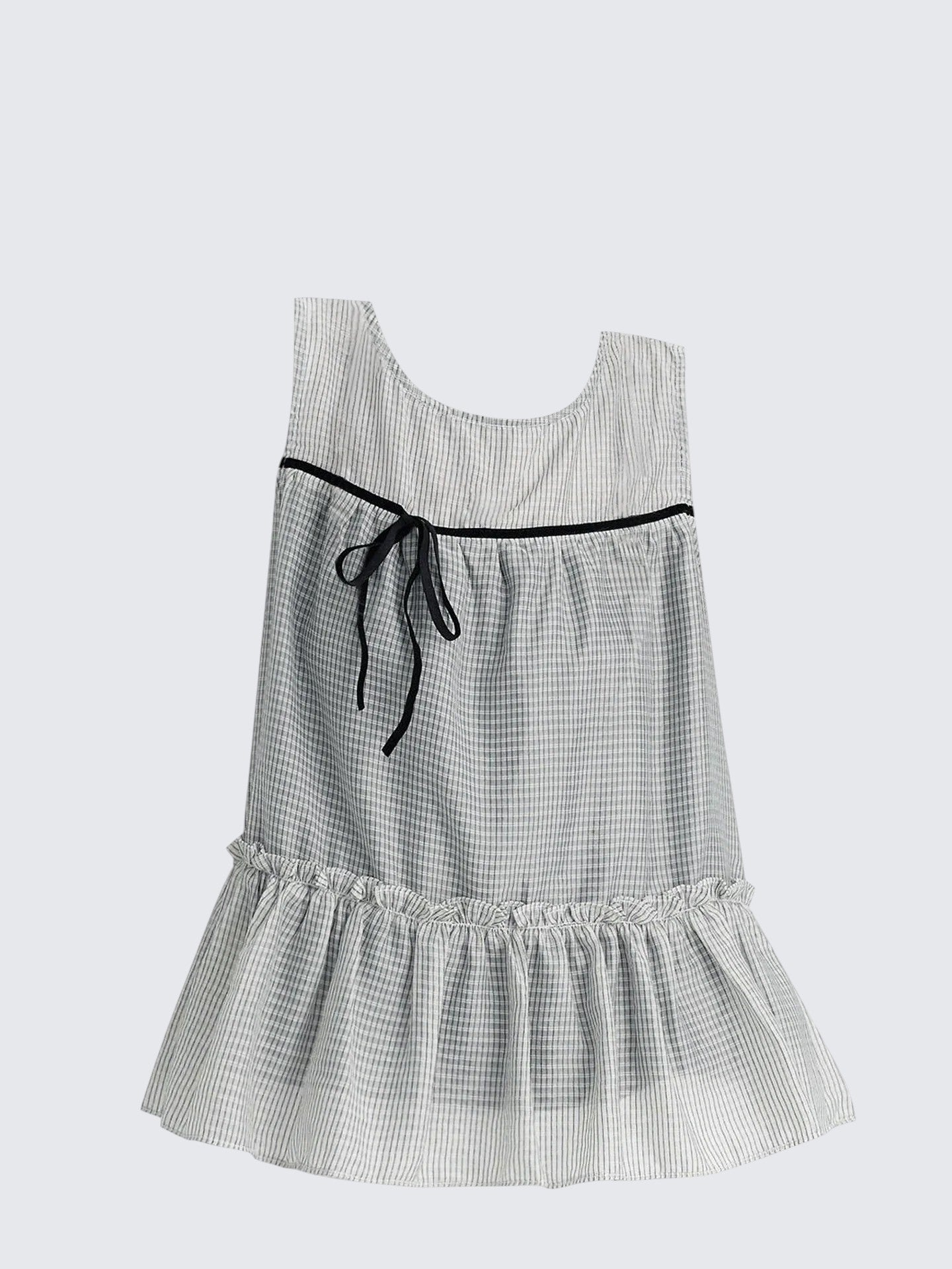 - Top: Sleeveless babydoll blouse with gingham pattern, bow tie detail, and mesh patchwork design.