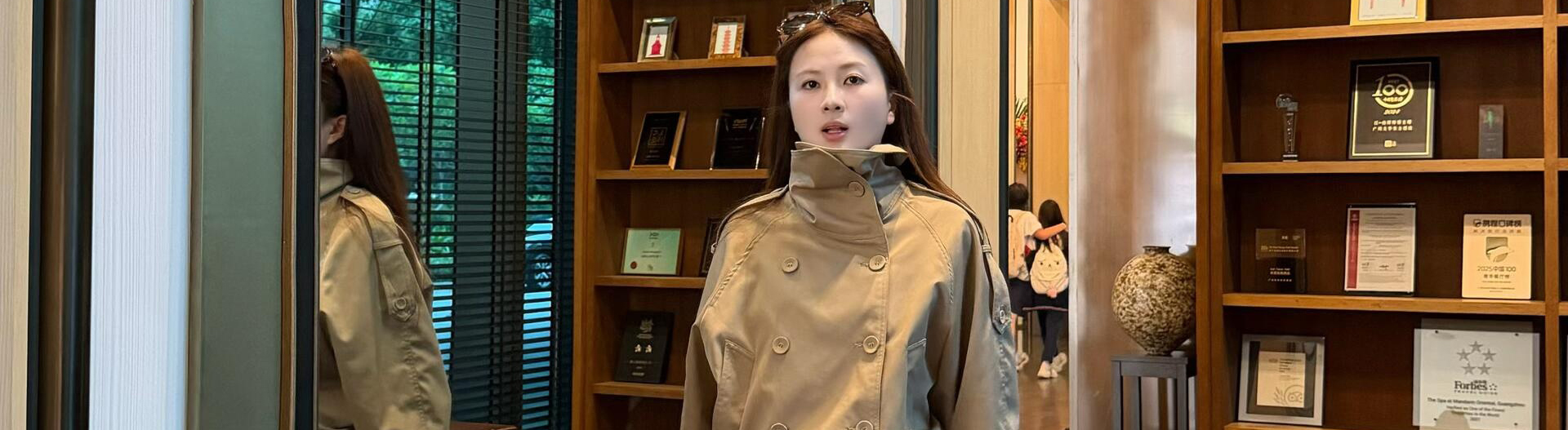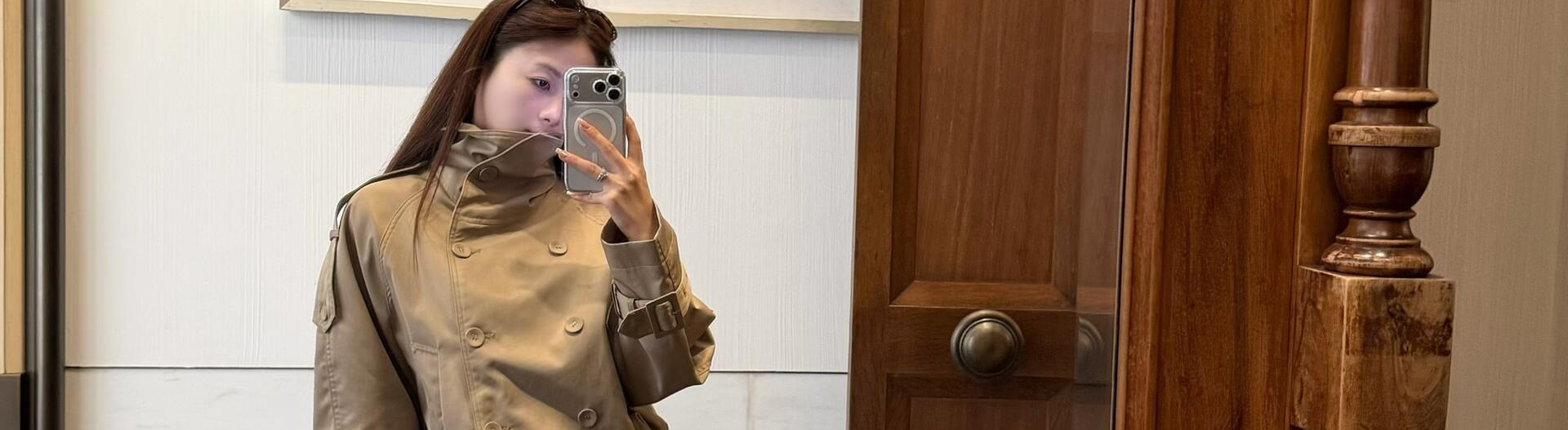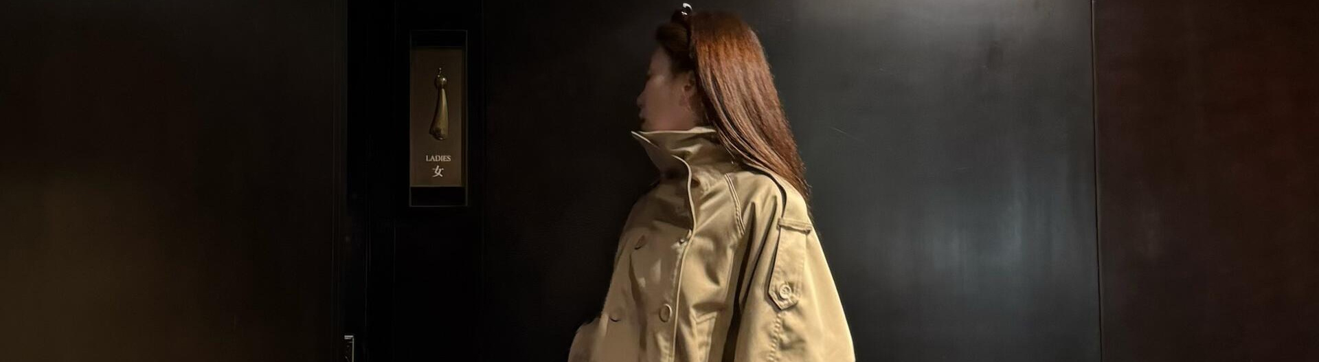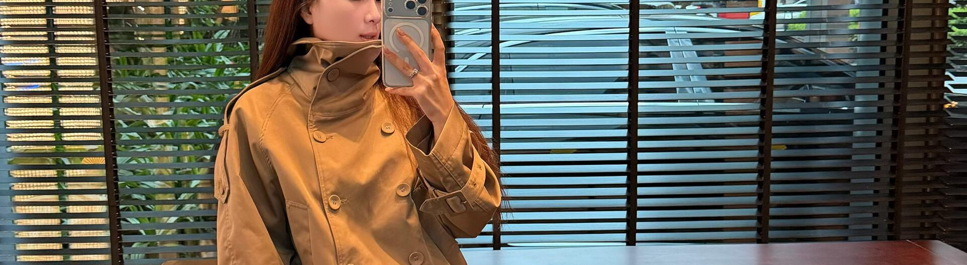 - Top: Short trench coat with stand collar, double-breasted buttons, tailored fit, khaki autumn fabric.