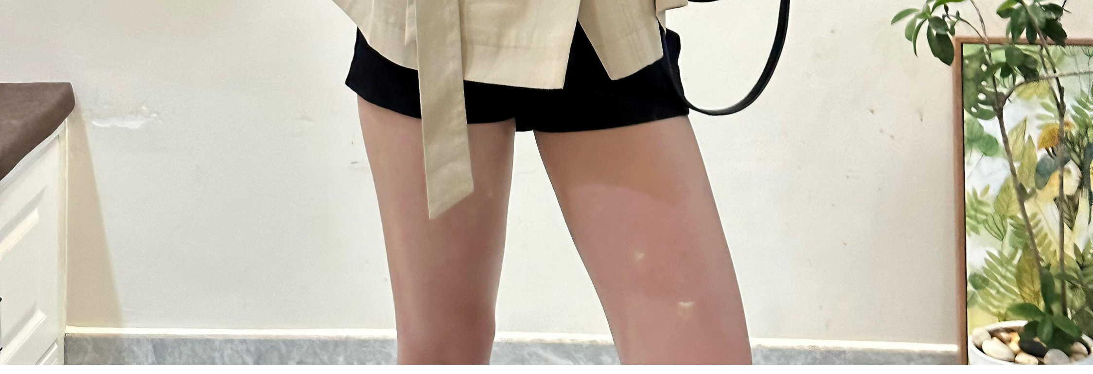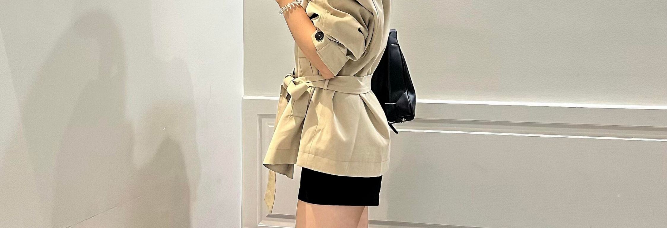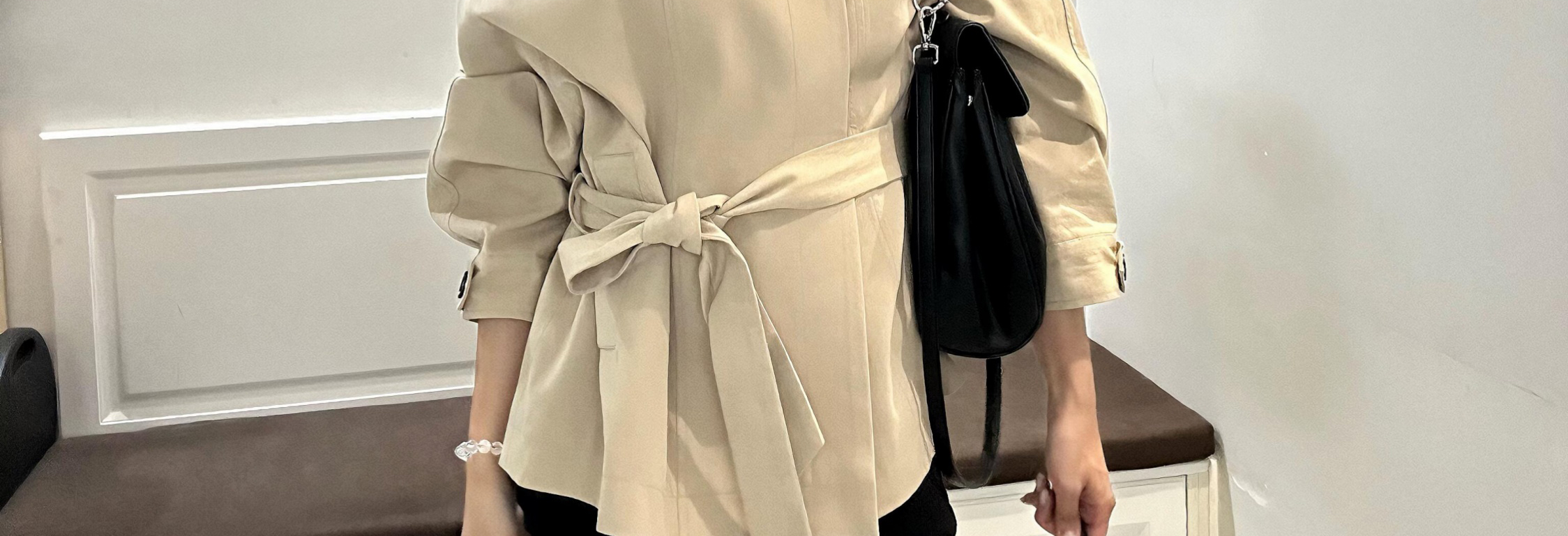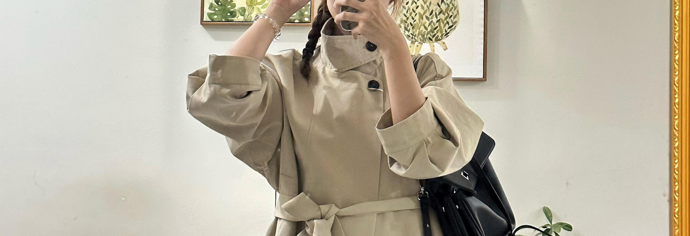 Elegant short trench coat with belted waist and stand collar. British-inspired design perfect for petite autumn looks.