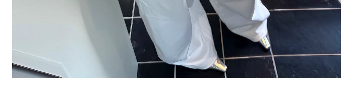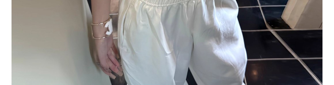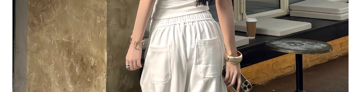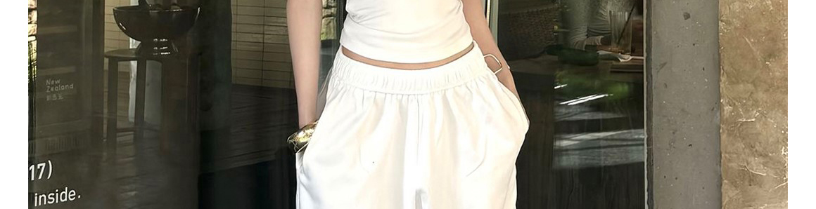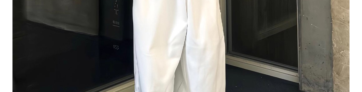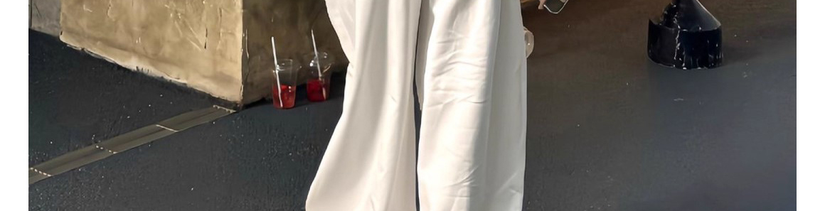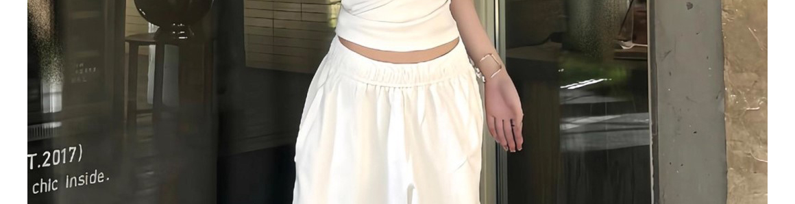 - Pants: Loose-fit wide-leg sweatpants in white, soft summer fabric, high-waist design, relaxed straight-leg cut.