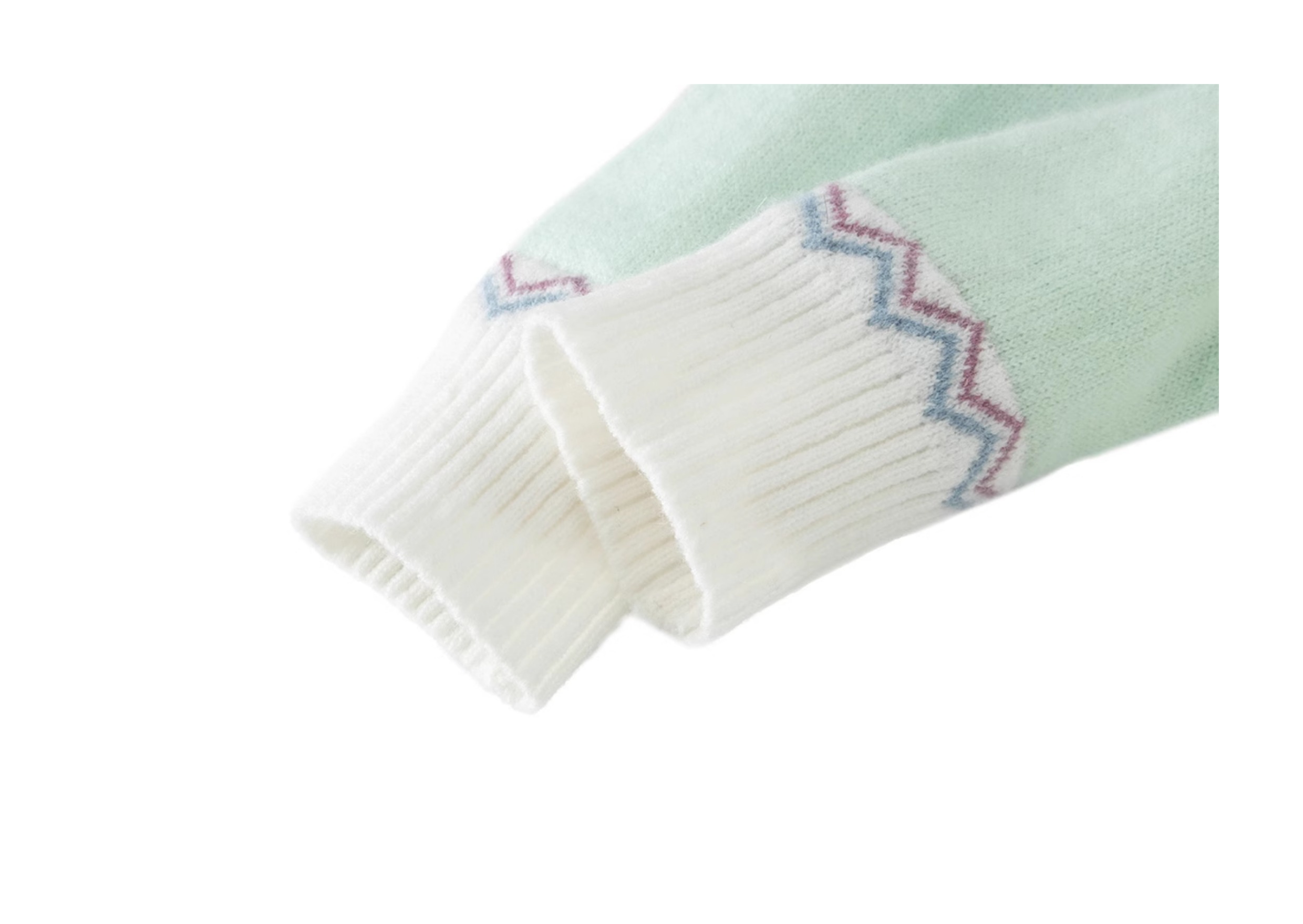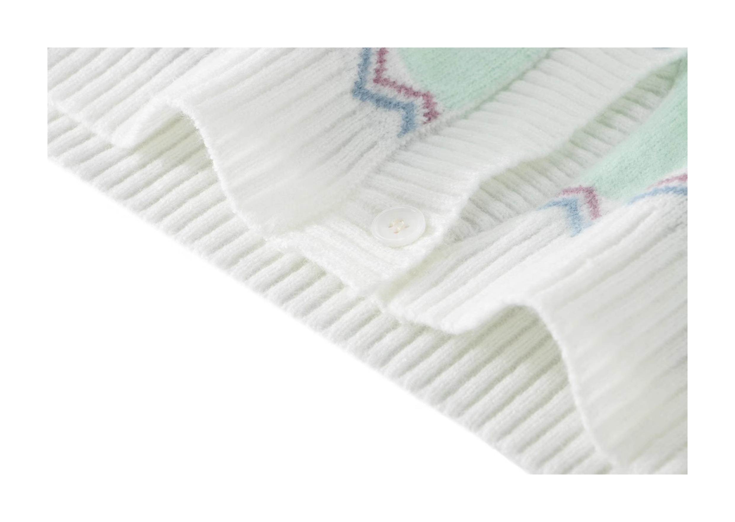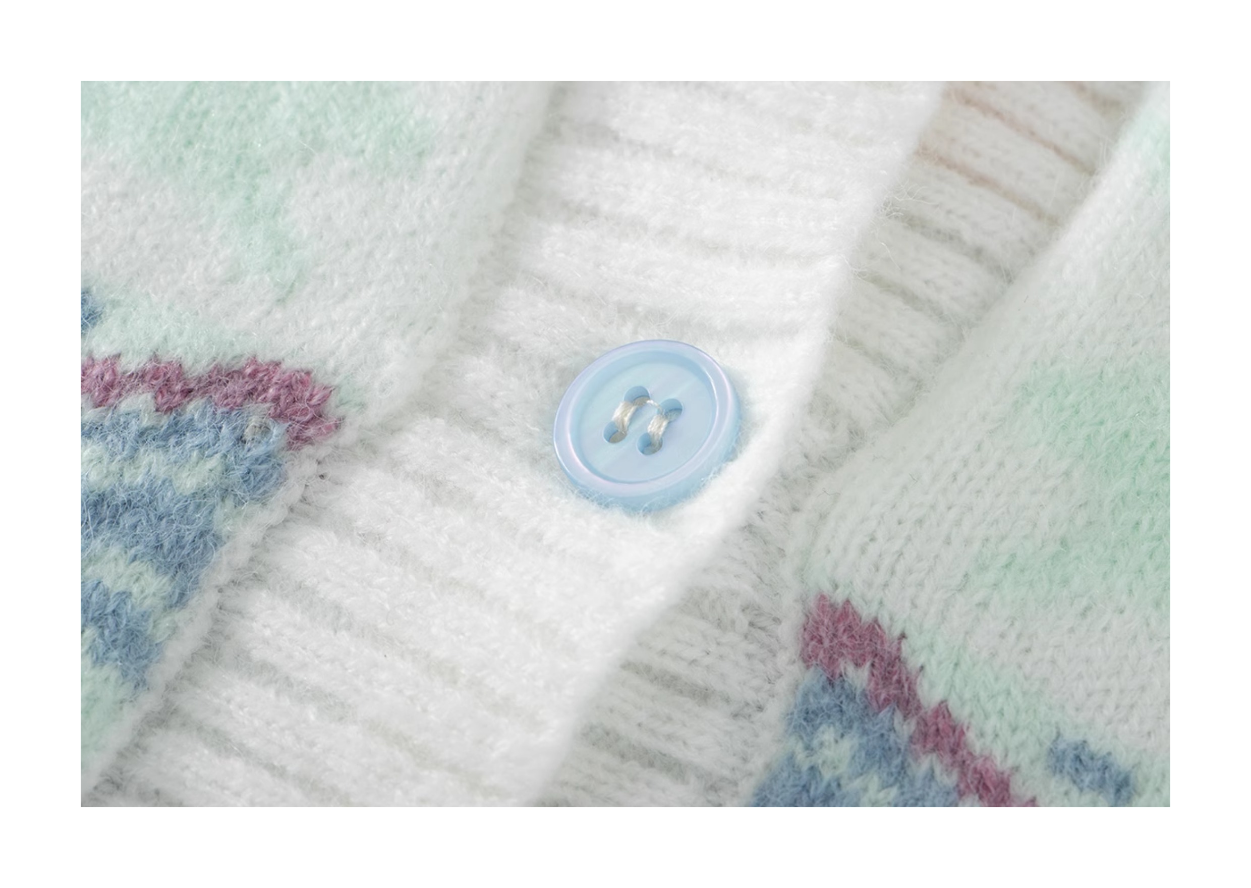 - Cardigan: Loose-fit knit cardigan with colorful jacquard, round neckline, soft spring/autumn fabric.