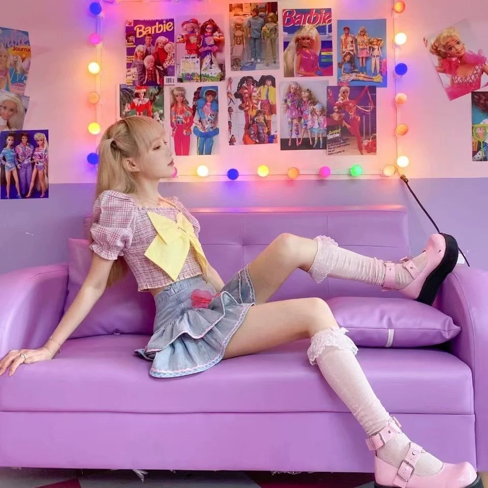 - Skirt: High-waisted fluffy cake skirt made of denim, blending Y2K Japanese cute style and casual denim texture. Slimming for summer.