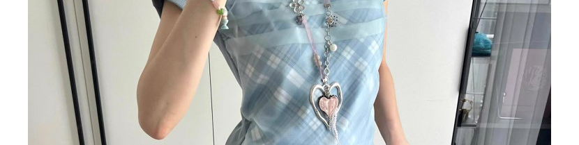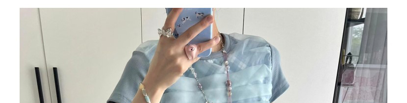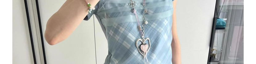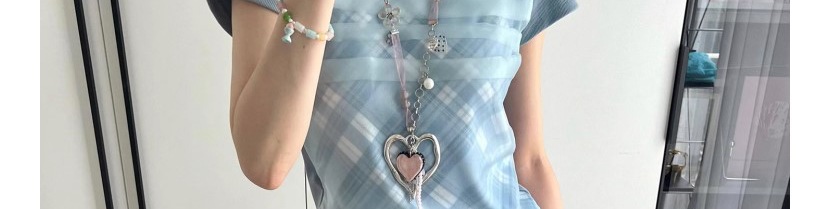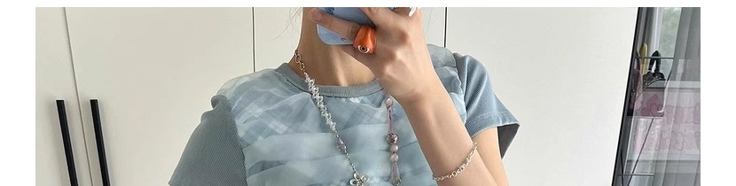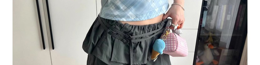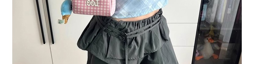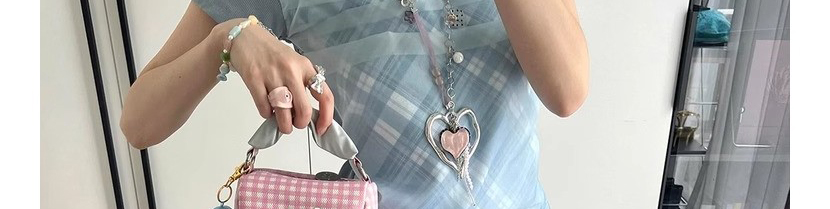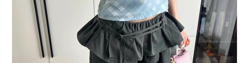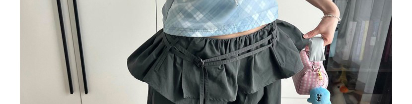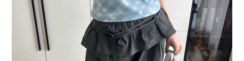 - Top: Light blue short-sleeve tee with plaid pattern, sheer ruffle details, and slim fit.