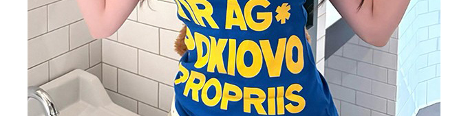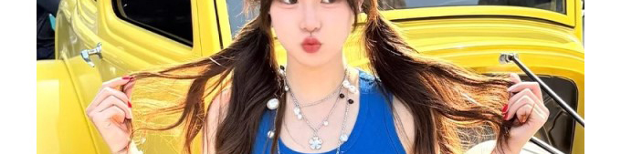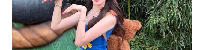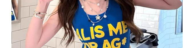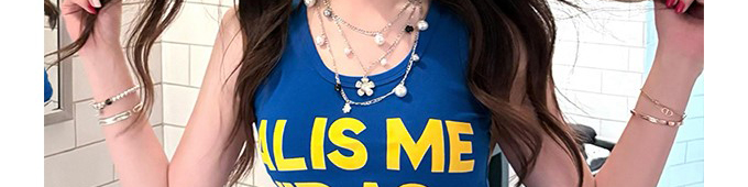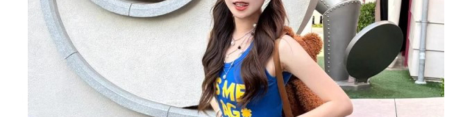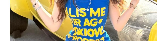 - Top: Slim-fit blue camisole with letter print, soft summer fabric and Y2K aesthetic.