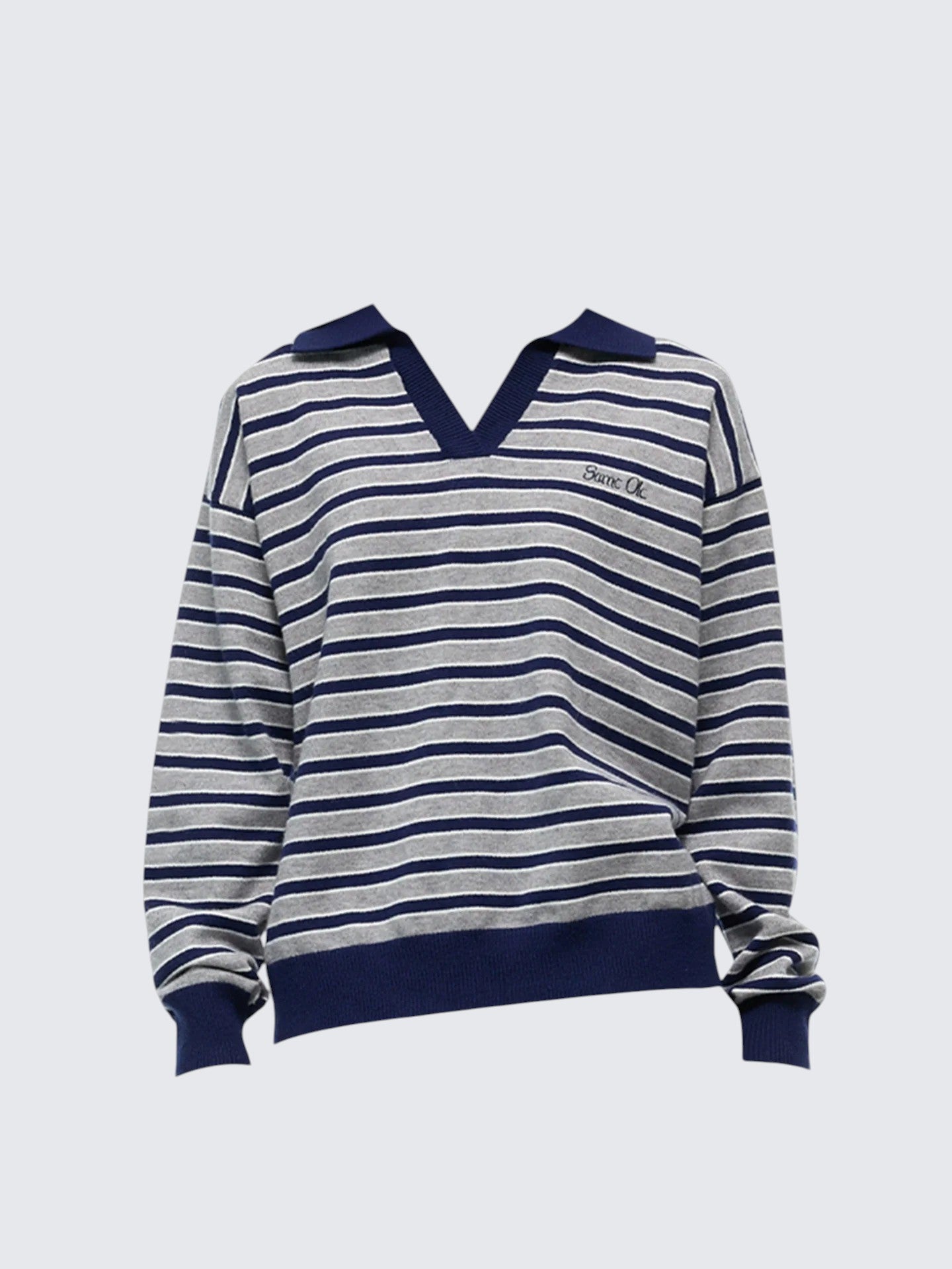 - Top: Loose-fit gray-blue striped V-neck top with embroidery, soft autumn-winter fabric, casual unisex style.