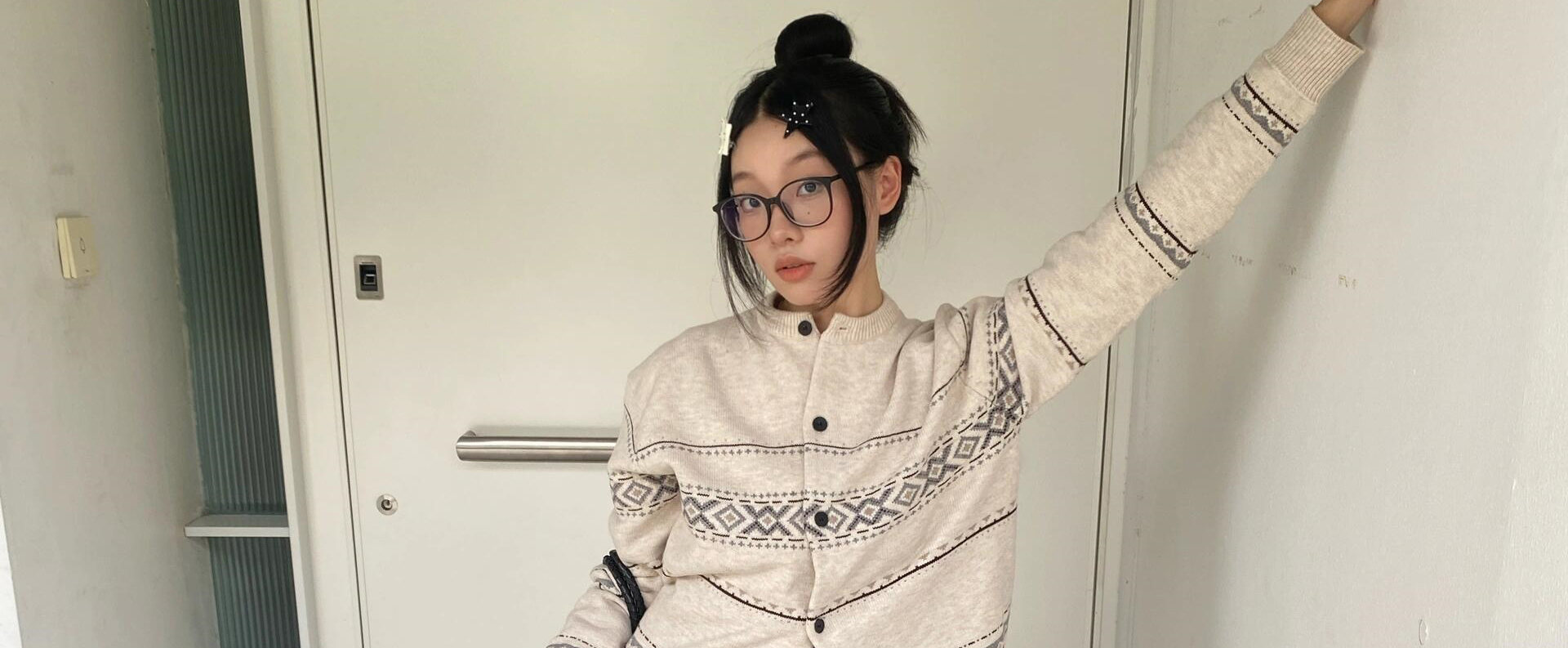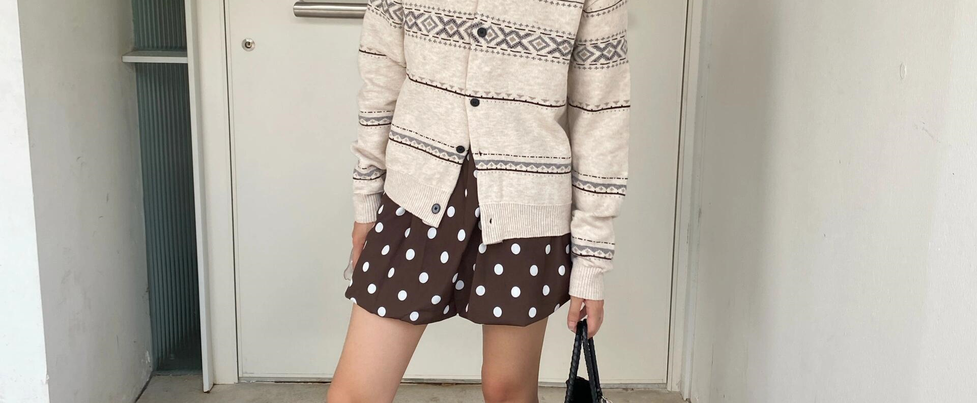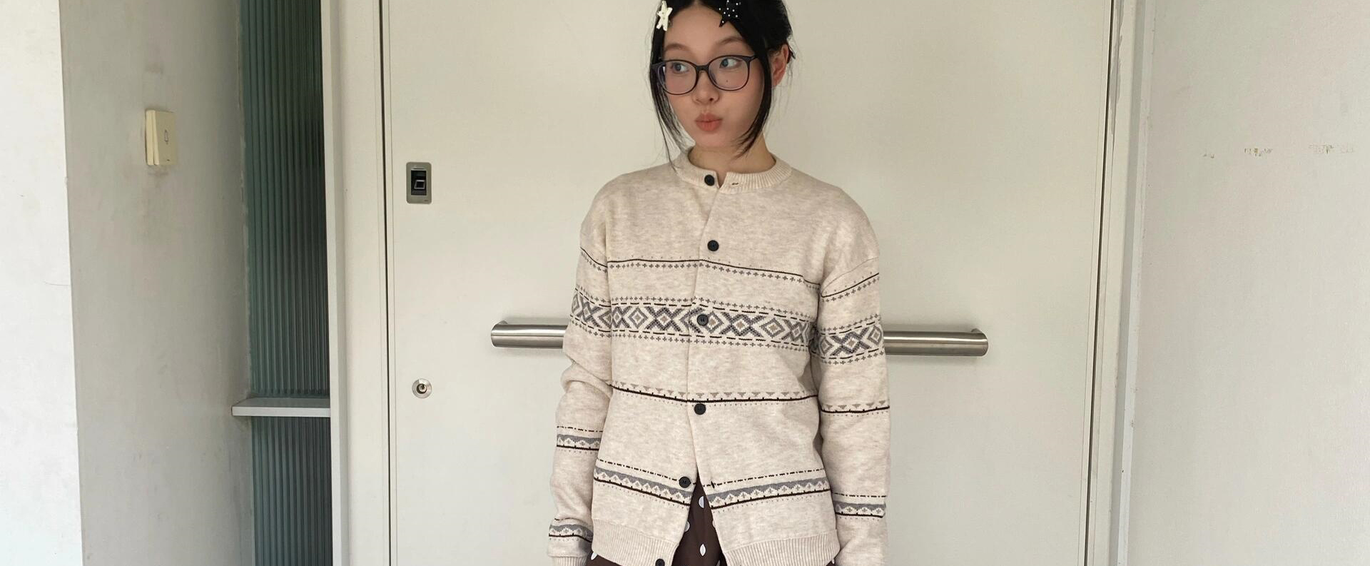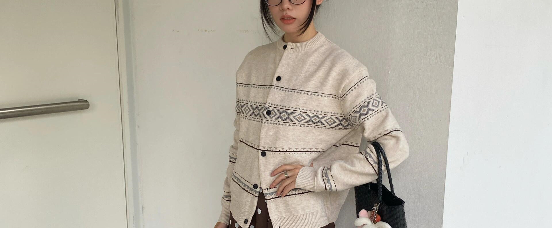 - Cardigan: Textured Fair Isle knit cardigan with soft cozy fabric, loose fit, autumn preppy style.