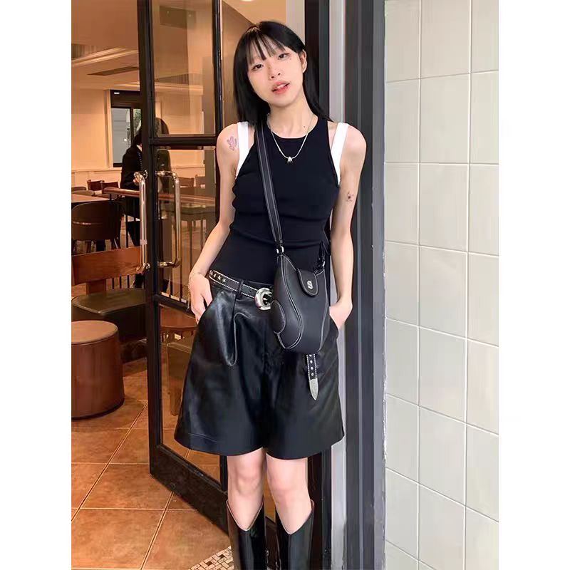 - Top: Short sleeveless tank with faux two-piece contrast design, soft summer fabric, slim-fit silhouette.