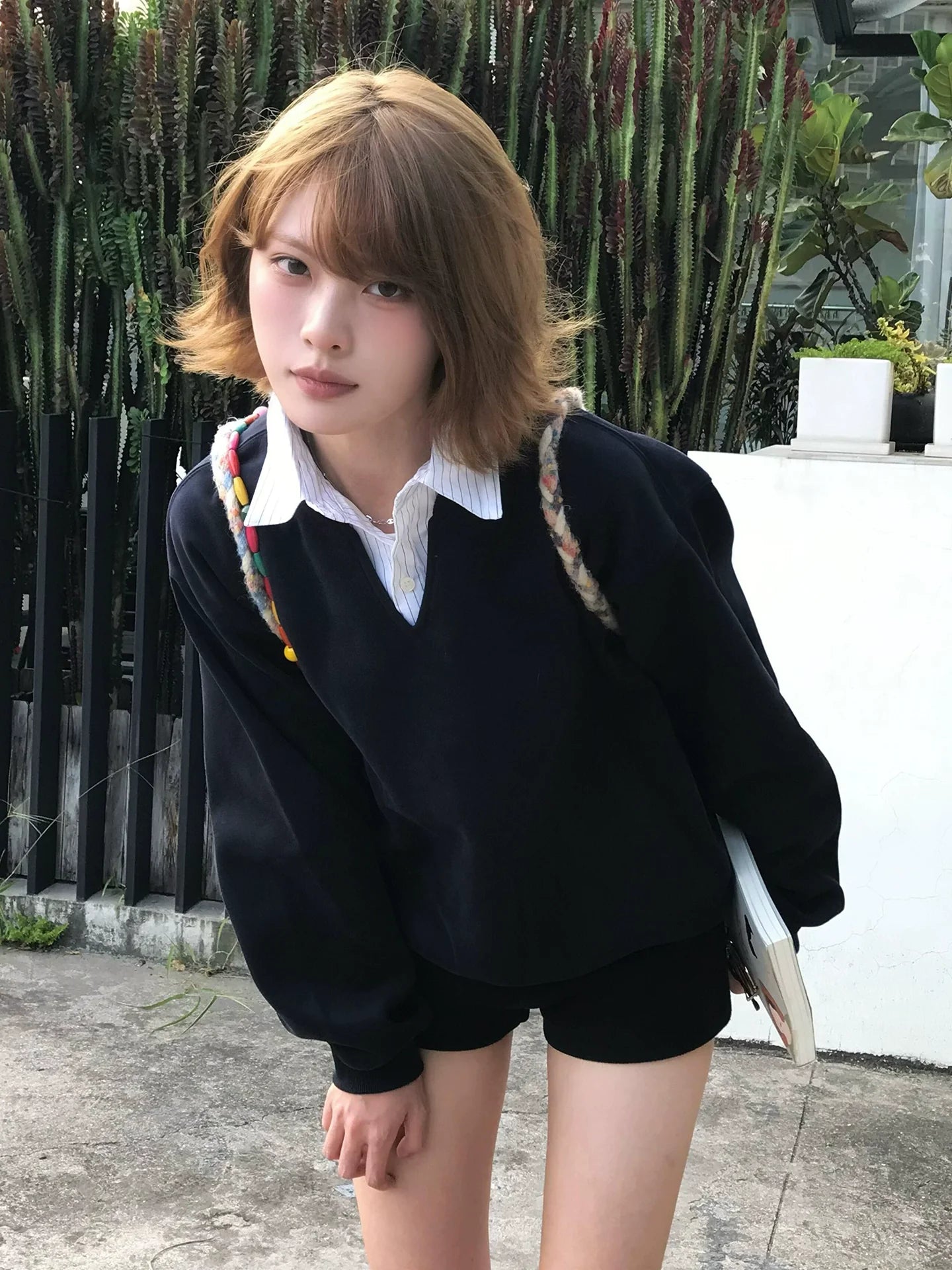 - Top: V-neck layered sweatshirt with stripe polo detail, relaxed fit, and academic-inspired style.