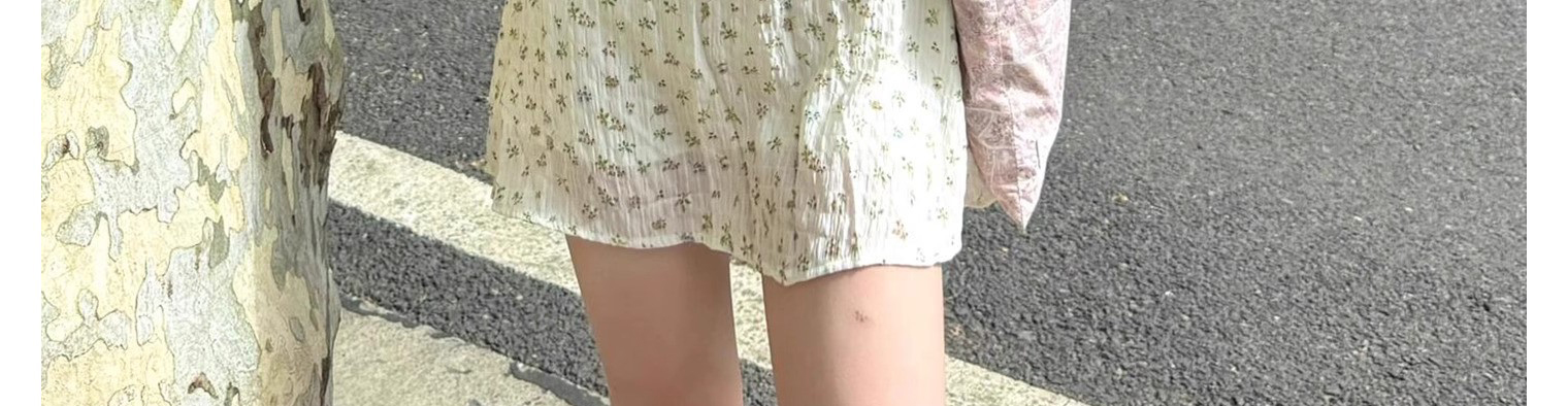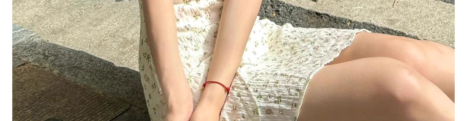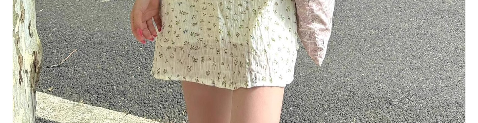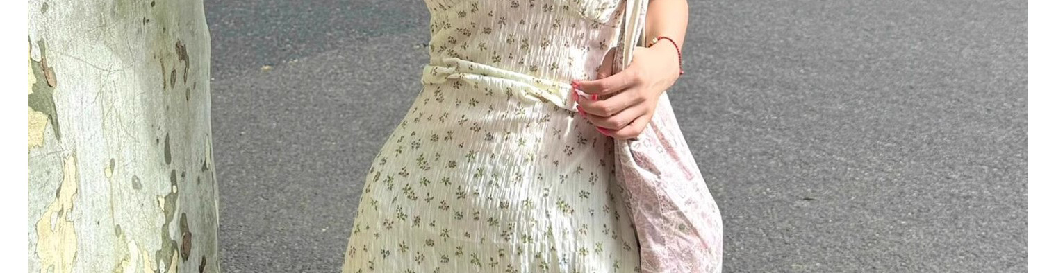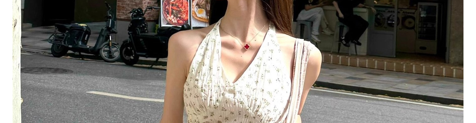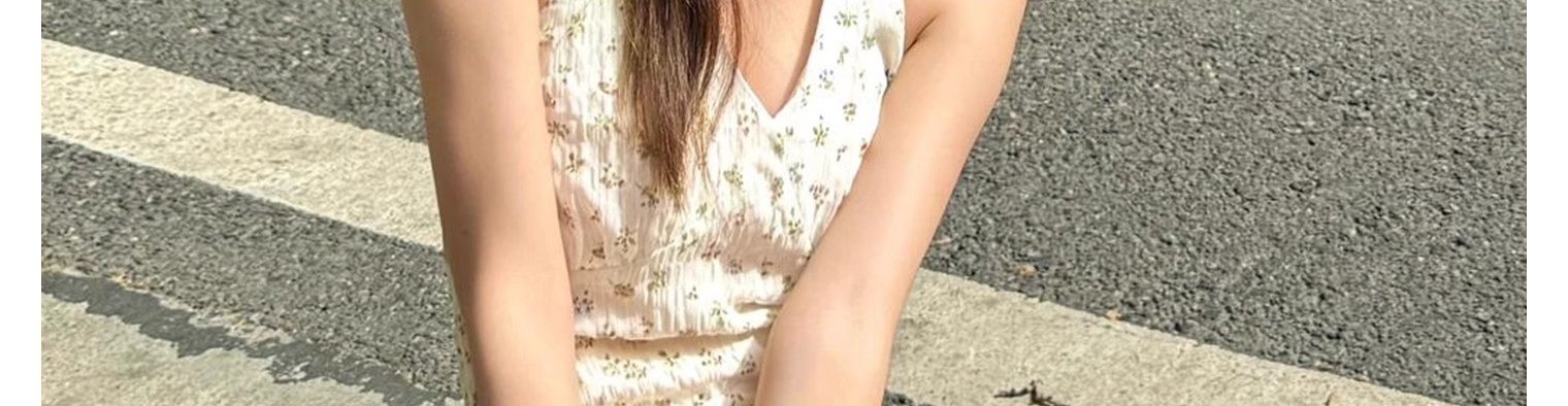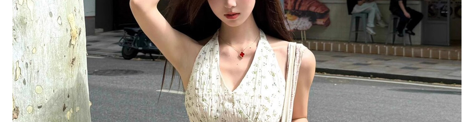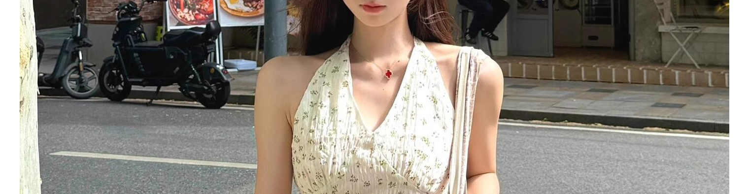 - Dress: Summer halter mini dress with floral print, A-line silhouette, fitted waist, soft breathable fabric.