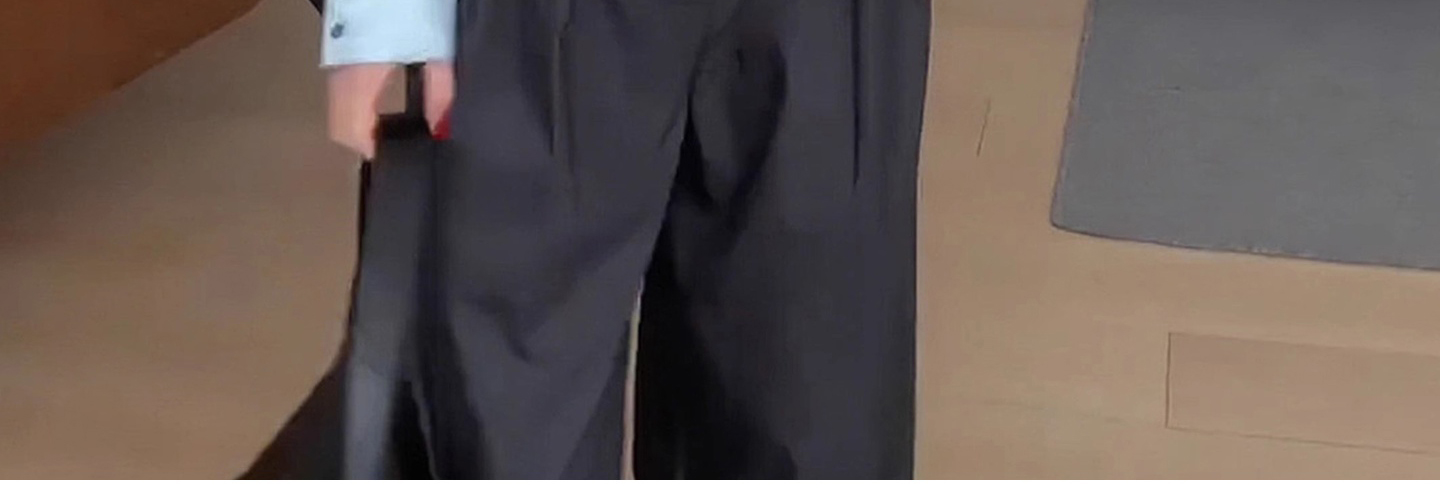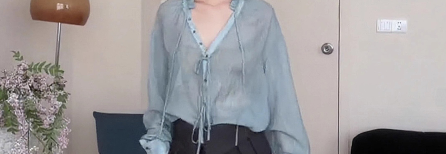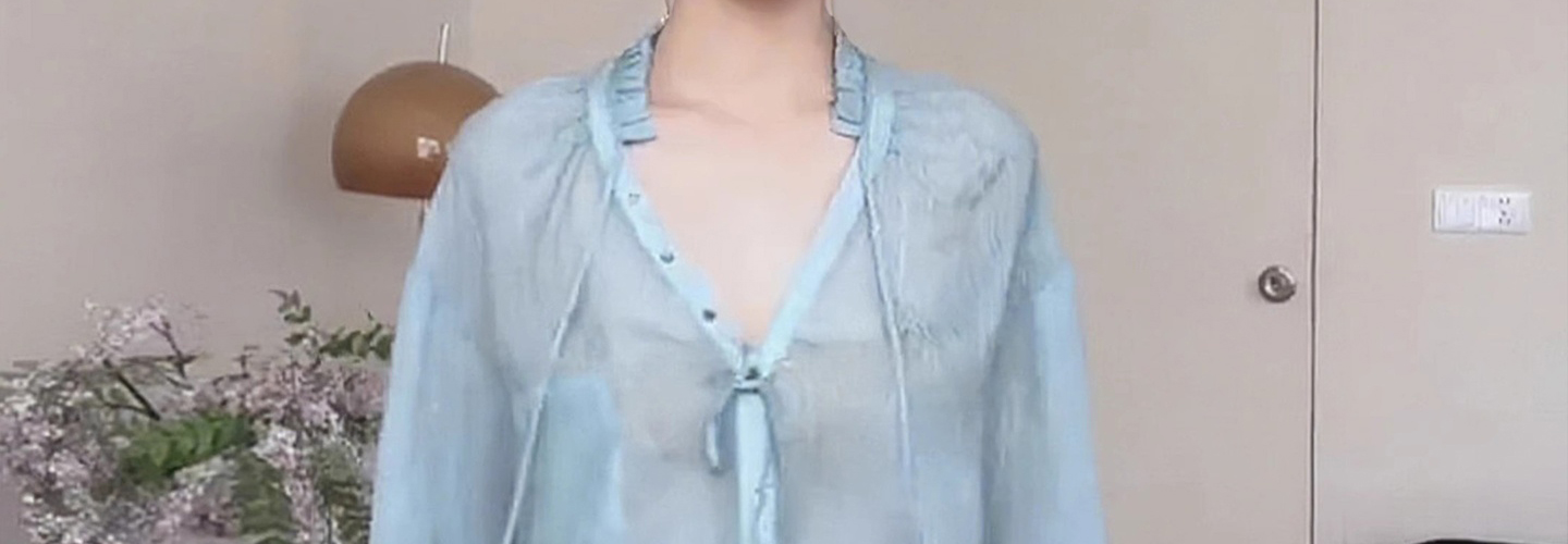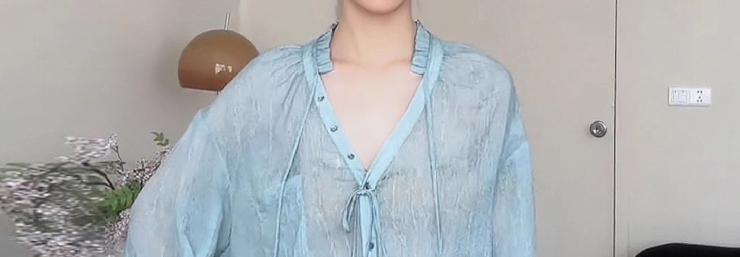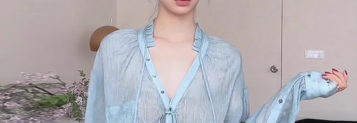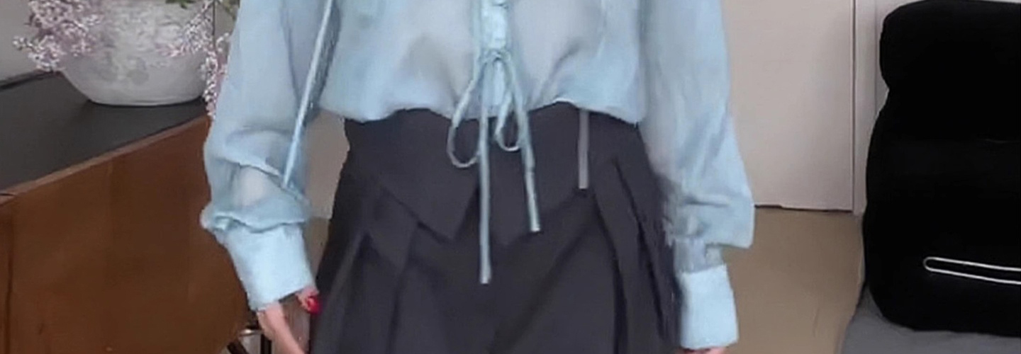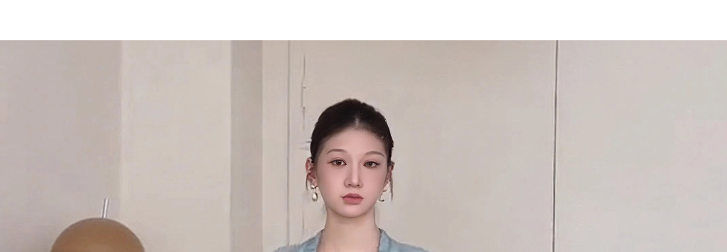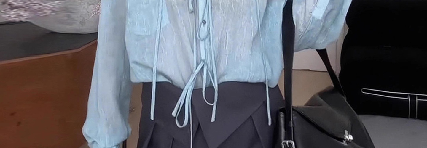 - Top: Light blue V-neck long-sleeve shirt with relaxed fit and soft French-inspired details.
