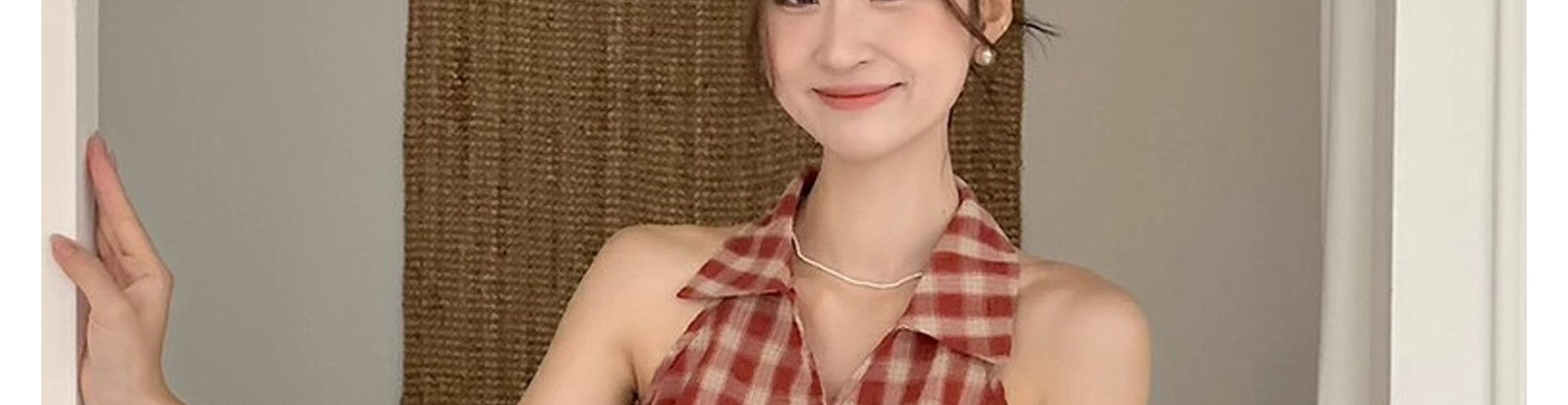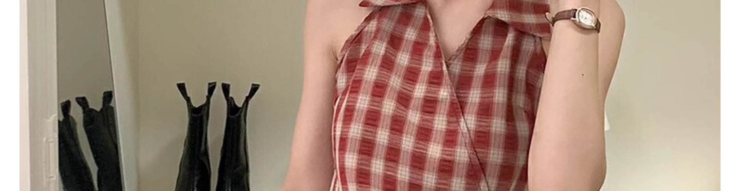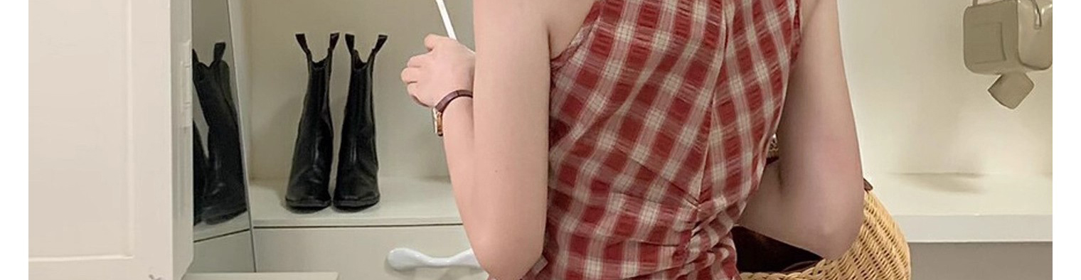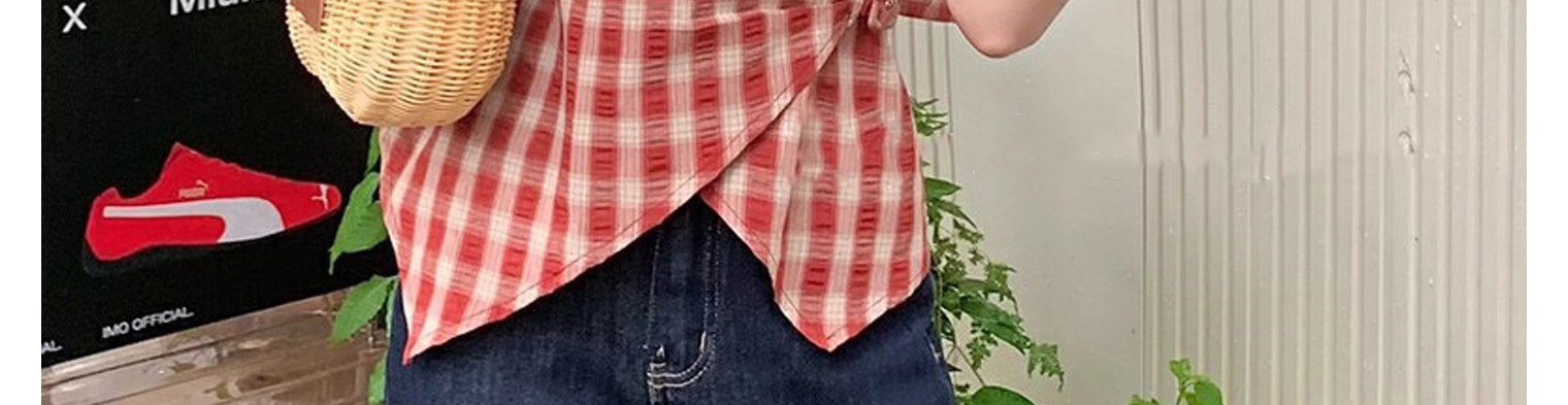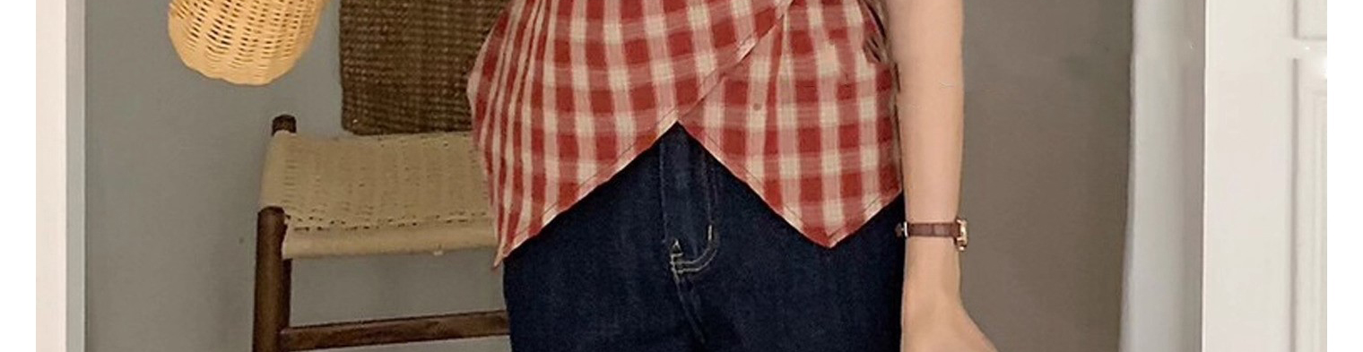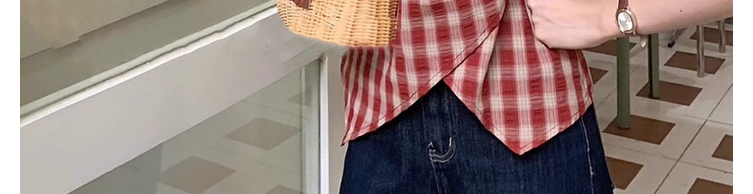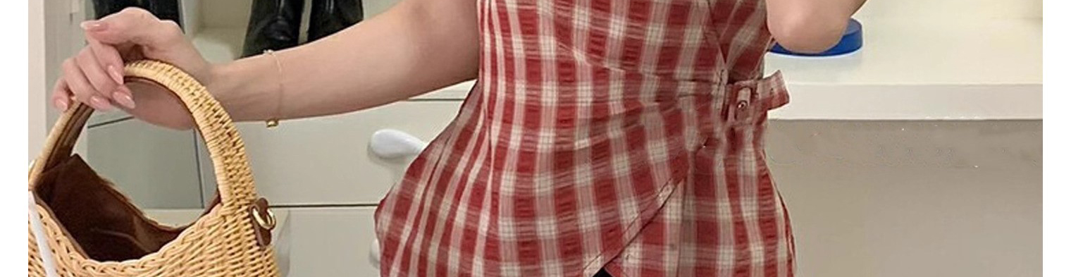 - Top: V-neck red check vest shirt, slim fit, irregular hem, chic French summer style.